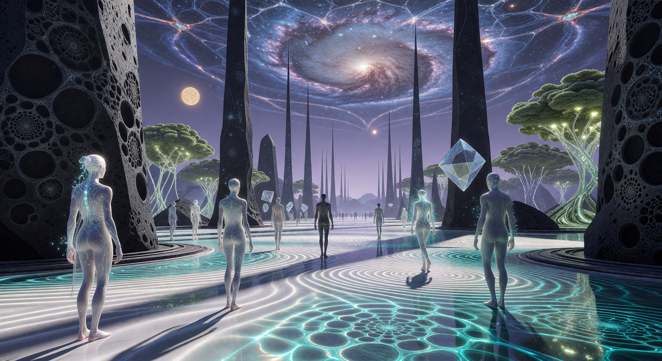 In dieser Darstellung der Synthesis-Plaza aus der Ära der Kosmischen Reife (ca. 20.000–100.000 n. Chr.) wandeln 2,5 Meter große Post-Humane mit biolumineszenten Nervennetzen und kristalline „Leeren-Glas“-Entitäten über einen Boden aus flüssigkeitsähnlichem Neo-Quarz. Vor der Kulisse eines binären Sternensystems ragen gewaltige Monolithen aus Programmierbarem Basalt empor, deren fraktale Oberflächen sich zur Klimasteuerung stetig verändern, während ein Deckenkonstrukt aus Hard-Light die Andromeda-Galaxie in den violetten Himmel projiziert. Diese Szenerie auf einem Gasriesenmond verdeutlicht den Übergang zur stellaren Vormundschaft, bei dem die Grenze zwischen biologischer Evolution und ontologischer Ingenieurskunst vollständig aufgehoben wurde.