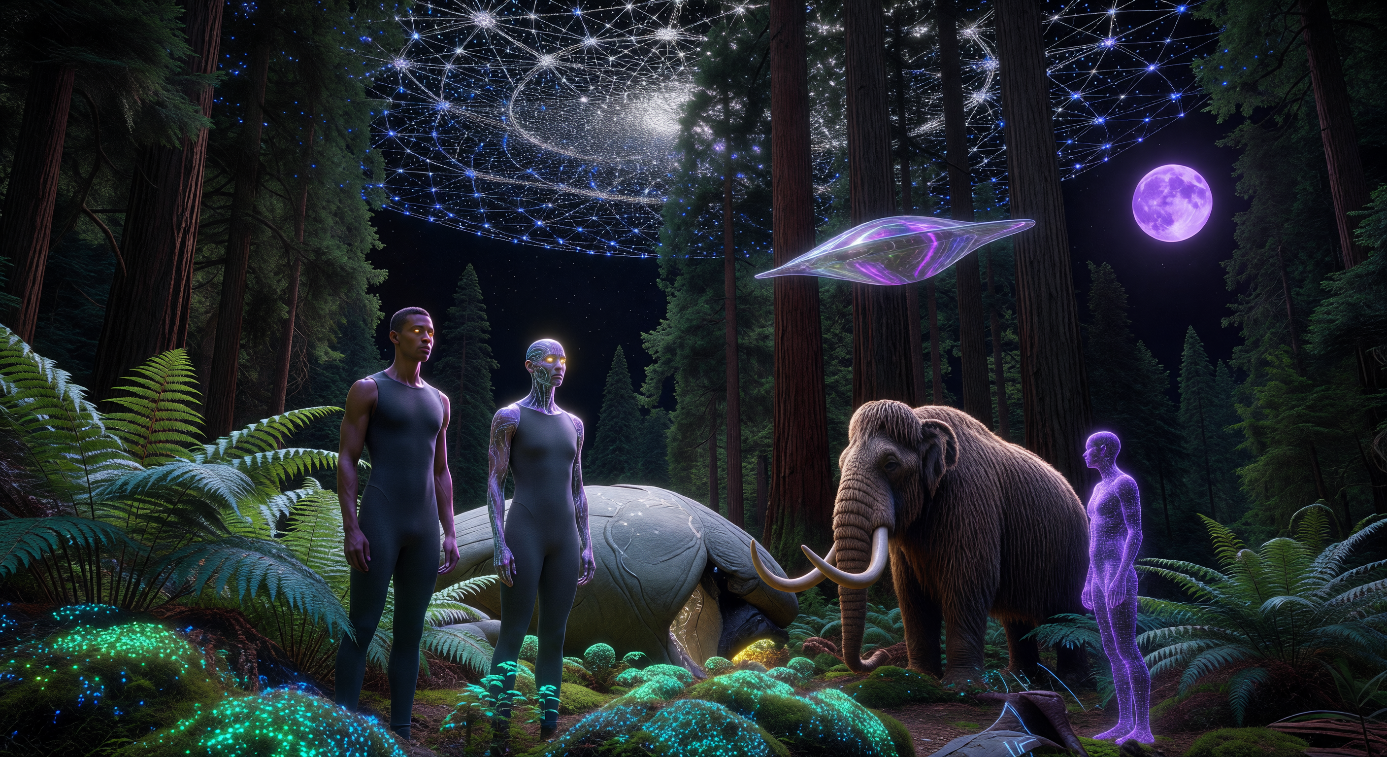 - English: Restored Mammoth Under Glowing Orbital Lattice and Giant Redwoods