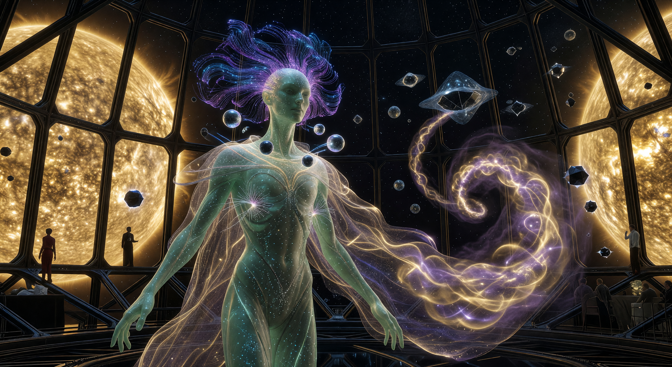 The caption, however, requires minor refinement. While the image strongly supports the period, region, and central figure, the specific claims about the diversity of guests—'Silicate and Gaseous Intelligences'—are not explicitly verifiable. The background silhouettes and geometric particles are too ambiguous to definitively confirm these distinct life forms over, say, complex robotic entities or environmental artifacts. The visual evidence supports 'diverse guests' and 'advanced morphologies,' but not the specific ontological categories named. Therefore, the image receives an 'approve' because it successfully visualizes the setting and primary subject, whereas the caption should be softened to reflect the limits of visual evidence.