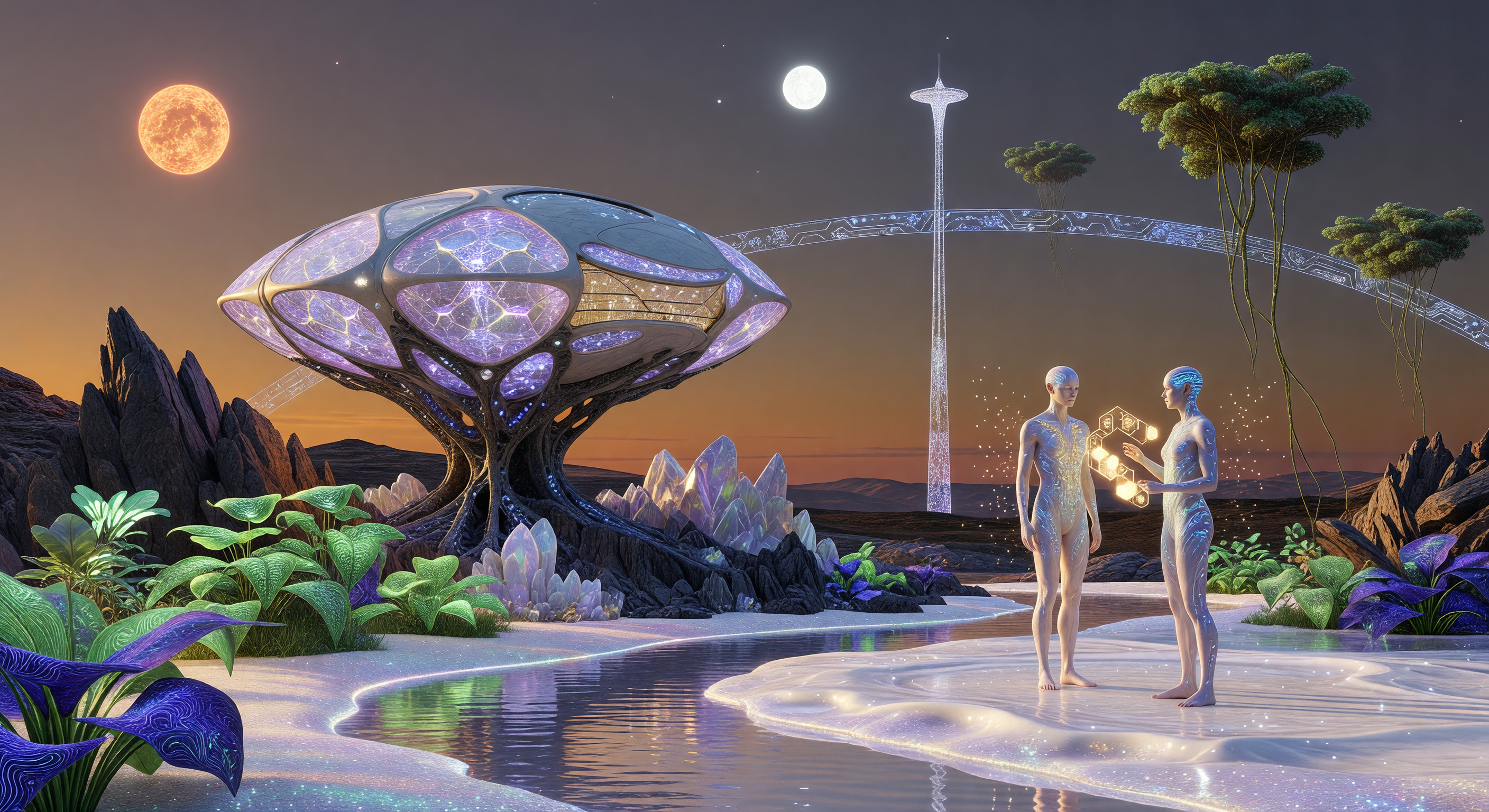 Bild: Die Szene wirkt visuell konsistent für spekulative „Far-Future“-Architektur/Urbanistik: eine große biomechanische Struktur mit leuchtenden, interfaceartigen Mustern, ein Ökosystem aus wie konstruiert wirkender Flora sowie zwei posthumane, an geringe Schwerkraft angepasste Humanoide nahe einem reflektierenden Wasserbereich. Das Vorhandensein eines hellen, kreisförmigen Sterns links und eines kleineren, hellen, sonnenartigen Objekts deutet auf „Binärstern“-Beleuchtung hin, was grob mit dem astronomischen Ausgangspunkt der Bildunterschrift übereinstimmt. Einige Elemente sind jedoch mehrdeutig oder visuell inkonsistent mit den spezifischen Behauptungen der Bildunterschrift: Die Vordergrundstruktur liest sich eher als eine monolithische biomechanische Kapsel/Installation denn als eine 50 Meter große Residenz, die sichtbar „aus der planetaren Kruste über ultrasonisches Lithic Grafting“ hervorgewachsen ist. Die Flora sowie Wasser-/Bodenmaterialien wirken plausibel außerirdisch, sind aber nicht klar mit Datenspeicherung verknüpft (z. B. keine offensichtlichen Samen-/Blattdaten-Artefakte) und auch nicht mit einem wachstumsbasierten Prozess, der aus der Kruste abgeleitet ist. Zudem scheint die Architektur vom Boden abgesetzt zu sein—als eigenständige Masse—statt nachweislich aus der umgebenden Geologie „aufgepfropft“ zu werden.