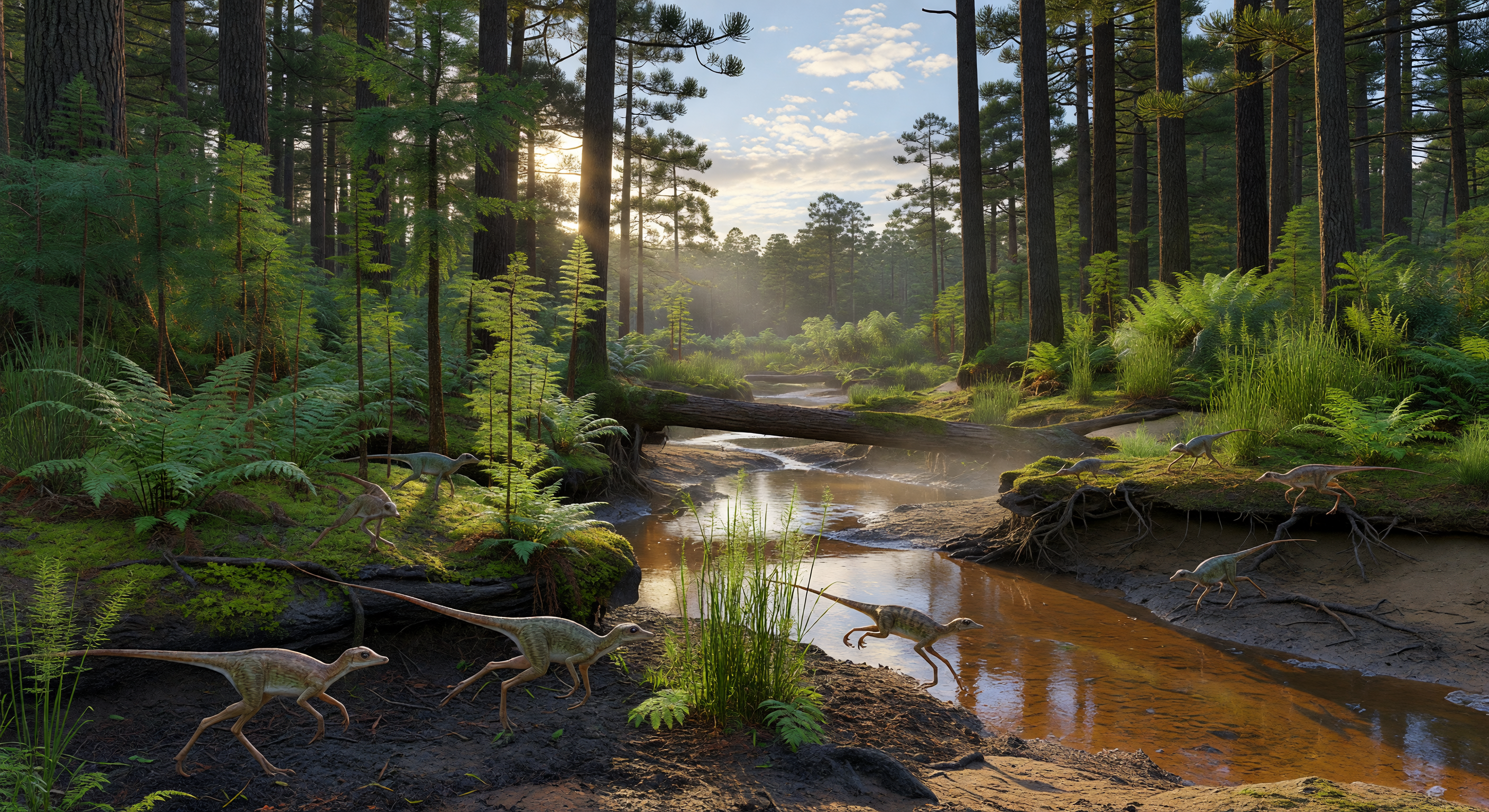 In einem kühlen, lichtdurchfluteten Polarwald des südöstlichen Australiens huschen Leaellynasaura amicagraphica und Qantassaurus intrepidus zwischen Farnen, Schachtelhalmen und moosigen Baumstämmen am Rand eines bernsteinbraunen Baches hindurch. Diese kleinen, zweibeinigen Ornithopoden lebten vor etwa 113–105 Millionen Jahren in der frühen Kreidezeit in der Otway–Gippsland-Region, damals weit innerhalb des südlichen Polarkreises – in einer Welt mit langen dunklen Wintern, aber ohne dauerhaftes Eis. Die hochgewachsenen Podokarpen und Araukarien über ihnen zeigen, dass selbst hohe Breiten der Kreide keine Tundra, sondern üppige Nadelwälder trugen, in denen flinke Pflanzenfresser an das dämmrige Saisonlicht angepasst waren.