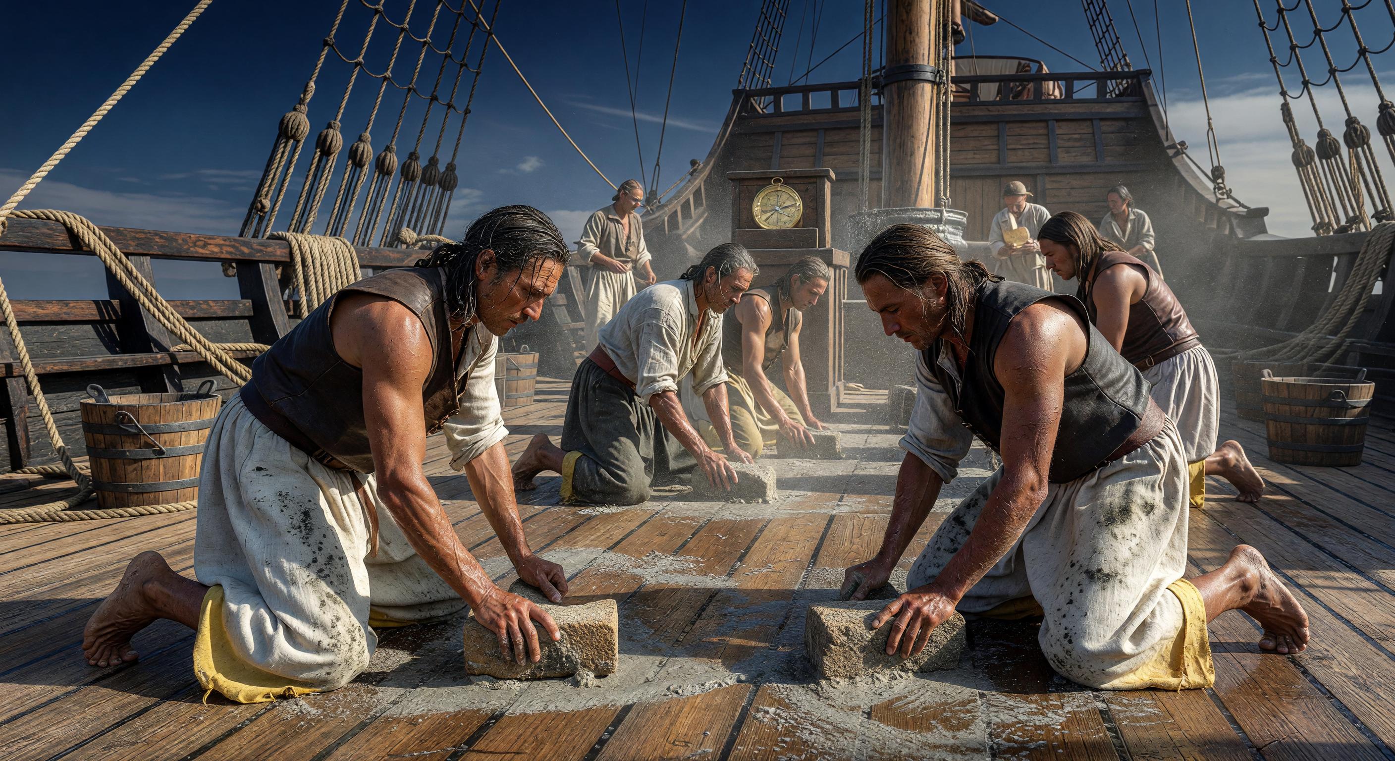 Caption: The core claim—holystoning (scrubbing decks) with abrasive material while ships are underway or at sea—is broadly consistent with known sailing-practice. The wording “mid-16th-century Spanish galleon” and the focus on Atlantic crossings is reasonable for the Renaissance period. But there are weaknesses: (1) “with abrasive sandstone blocks and seawater” is plausible yet too specific—sources usually describe abrasive stone/holystone and water, but not necessarily sandstone specifically; “holystone” in particular refers to a type of stone rather than a generic sandstone, so the mineral specificity may be misleading. (2) “Toiling barefoot… carvel-built deck” is plausible, but the image does not clearly demonstrate carvel construction vs. other deck edge/caulking details; the caption asserts construction method without visual support. (3) “wear waterproofed with tar” is not clearly evidenced in the depicted garments (they read more like wet/dirty linen rather than visibly tarred clothing). Finally, the captain’s reference to “global powers transformed the oceans into bustling corridors” is broadly thematic but not a concrete factual claim about the specific practice shown. Overall, the caption is mostly on-target but would benefit from less-specific materials and more cautious construction/clothing assertions.