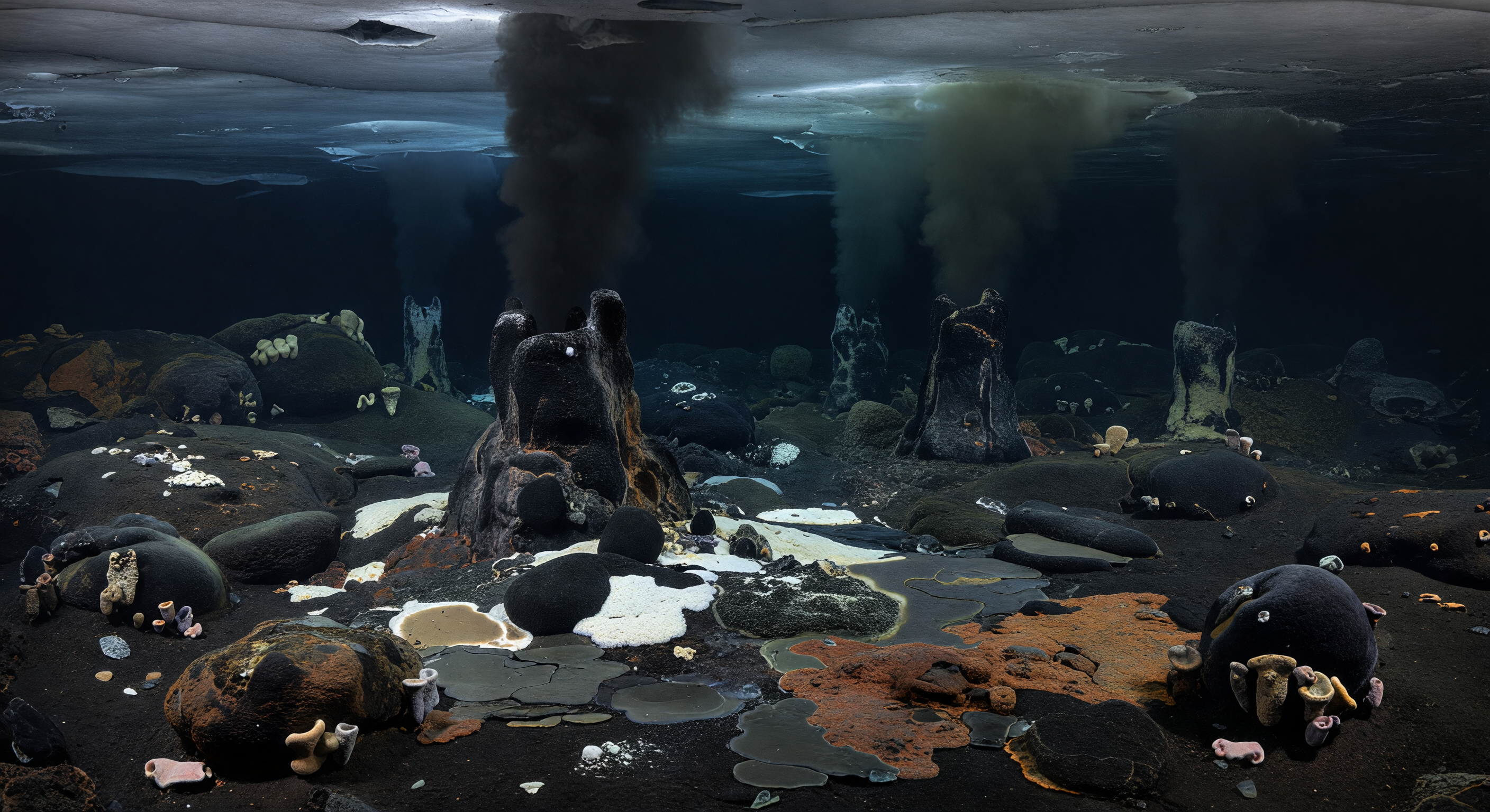 Unter dem gewaltigen Eis der kryogenen „Schneeball-Erde“ vor etwa 720–635 Millionen Jahren ragen 2–4 Meter hohe Schwarze Raucher aus basaltischer Ozeankruste empor und stoßen dichte, metallreiche Wolken in das nahezu gefrierende Wasser. Auf den Pillow-Basalten und eisenverkrusteten Gesteinen liegen weiße, rostfarbene und braune Mikrobenteppiche aus schwefel- und eisenverwertenden Gemeinschaften, während an den kühleren Rändern nur wenige einfache schwammartige Tiere der präkambrischen Fauna haften. Solche hydrothermalen Oasen an vulkanisch aktiven Meeresböden könnten zu den wichtigsten Rückzugsräumen des Lebens in dieser fast vollständig vereisten Welt gehört haben – einsame Inseln von Wärme und Chemie in der tiefen Dunkelheit der Erdgeschichte.