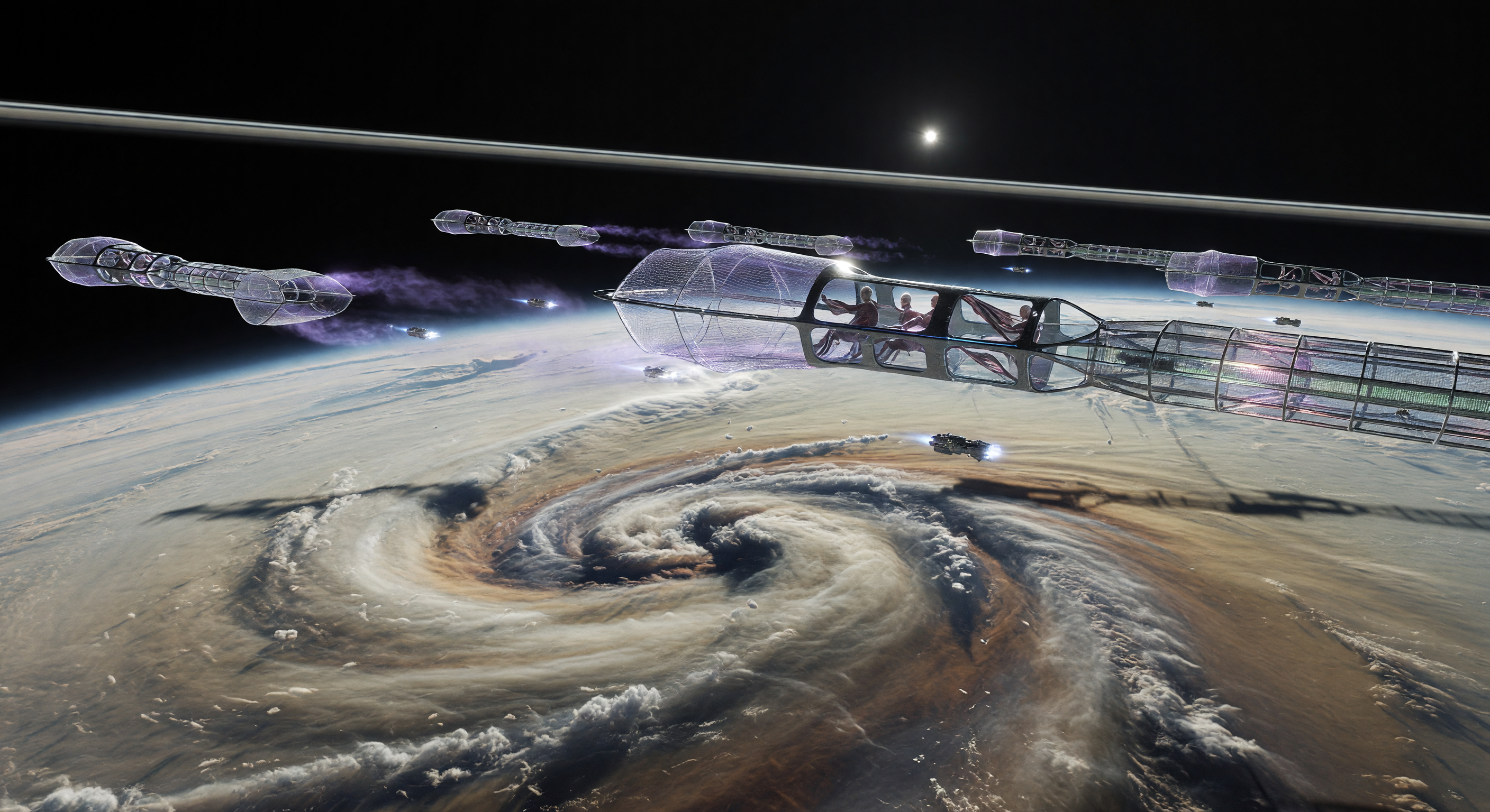 The image is visually compelling and does a reasonable job of conveying the core concept: elongated, mesh-like atmospheric harvesting vessels operating above a gas giant with a visible ring system. The presence of Saturn's rings in the upper portion of the frame is a significant positive that my GPT colleague underweighted — this is actually a clear Saturn identifier that grounds the scene geographically. The atmospheric coloration (tan, brown, cream banding with a large vortex storm) is broadly consistent with a Saturn-like gas giant, though the storm structure looks somewhat more Jupiter-like in its brown/cream tones rather than Saturn's typically more muted, hazy palette. The mesh/lattice construction of the harvesters is internally consistent with carbon-nanotube structural concepts. The human figures visible in the foreground craft are a concern — they appear baseline-human in proportion and dress, not distinctly 'post-human' or low-gravity adapted as described. The scale relationship between the craft and the planet is visually plausible for orbital/upper-atmospheric operations.