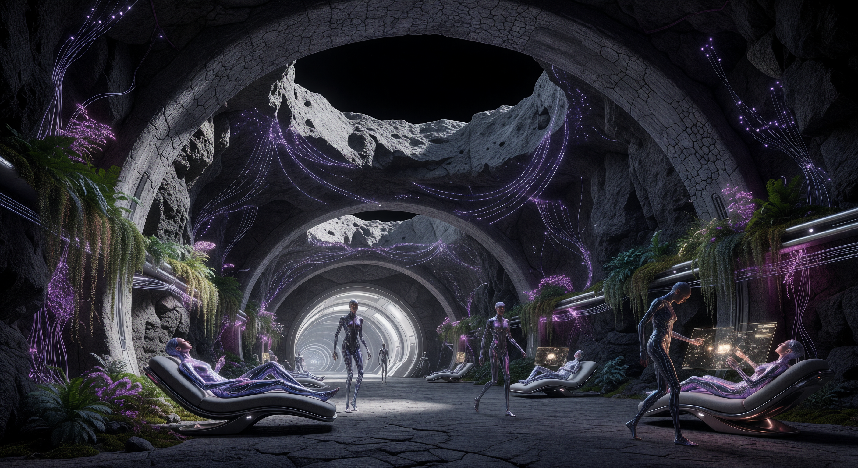 The image effectively captures a speculative 28th-century subterranean lunar habitat in Mare Tranquillitatis, with subtractive architecture carved into dark basaltic rock forming grand arched atria and tunnels, consistent with lunar geology. Lush, genetically modified flora integrated into the space, glowing bioluminescent/neon purple elements suggesting 'Morphic-Gel' tech, and elongated, translucent-skinned humanoid figures lounging on futuristic furniture align visually with low-gravity adaptations and self-sustaining ecosystems. The dim, shielded interior with surface lighting and implied regolith overhead (via rocky ceiling) conveys radiation protection without anachronisms; no Earth-like gravity is depicted, and the enclosed, coherent scene feels plausible for elite lunar luxury. Minor visual tweaks could enhance enclosure clarity, but it's scientifically and aesthetically strong for the speculative Solar Expansion era—no regeneration needed.
