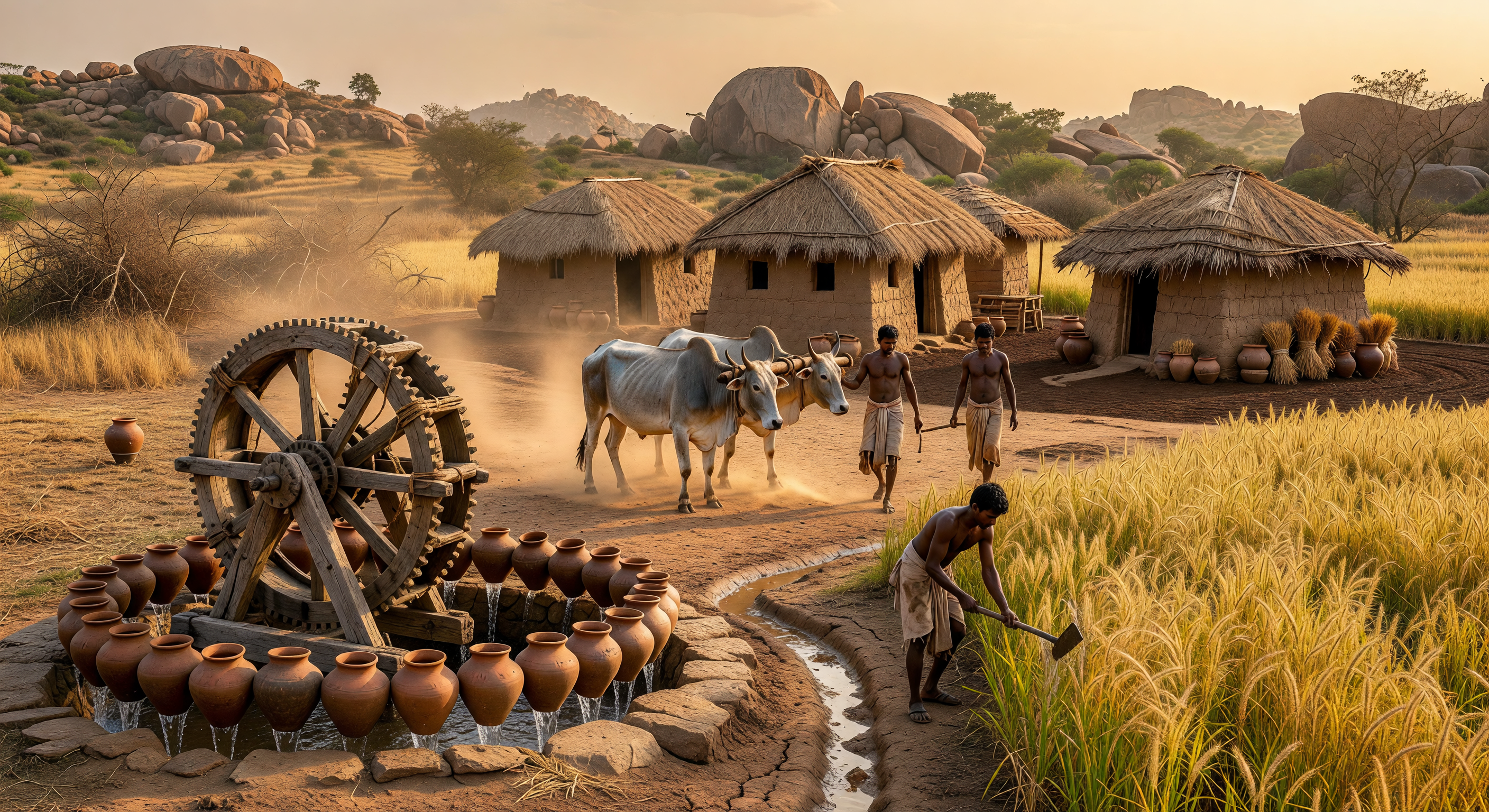 Auf dem sonnenverbrannten Dekkan-Plateau des späten 14. Jahrhunderts treiben kräftige Zebu-Rinder ein hölzernes Schöpfrad an, das kostbares Wasser aus einem tiefen Brunnen in die umliegenden Hirsefelder befördert. Die Bauern, bekleidet mit einfachen Lendentüchern aus handgewebter Baumwolle, lenken den Wasserfluss durch handgegrabene Kanäle, während im Hintergrund schlichte Lehmziegelhütten mit Strohdächern das dörfliche Leben dieser Ära widerspiegeln. Diese Darstellung fängt die mühsame landwirtschaftliche Realität Südasiens vor der Ankunft von Nutzpflanzen aus der Neuen Welt ein und verdeutlicht die Bedeutung fortschrittlicher Bewässerungstechniken für das Überleben in der rauen Granitlandschaft.