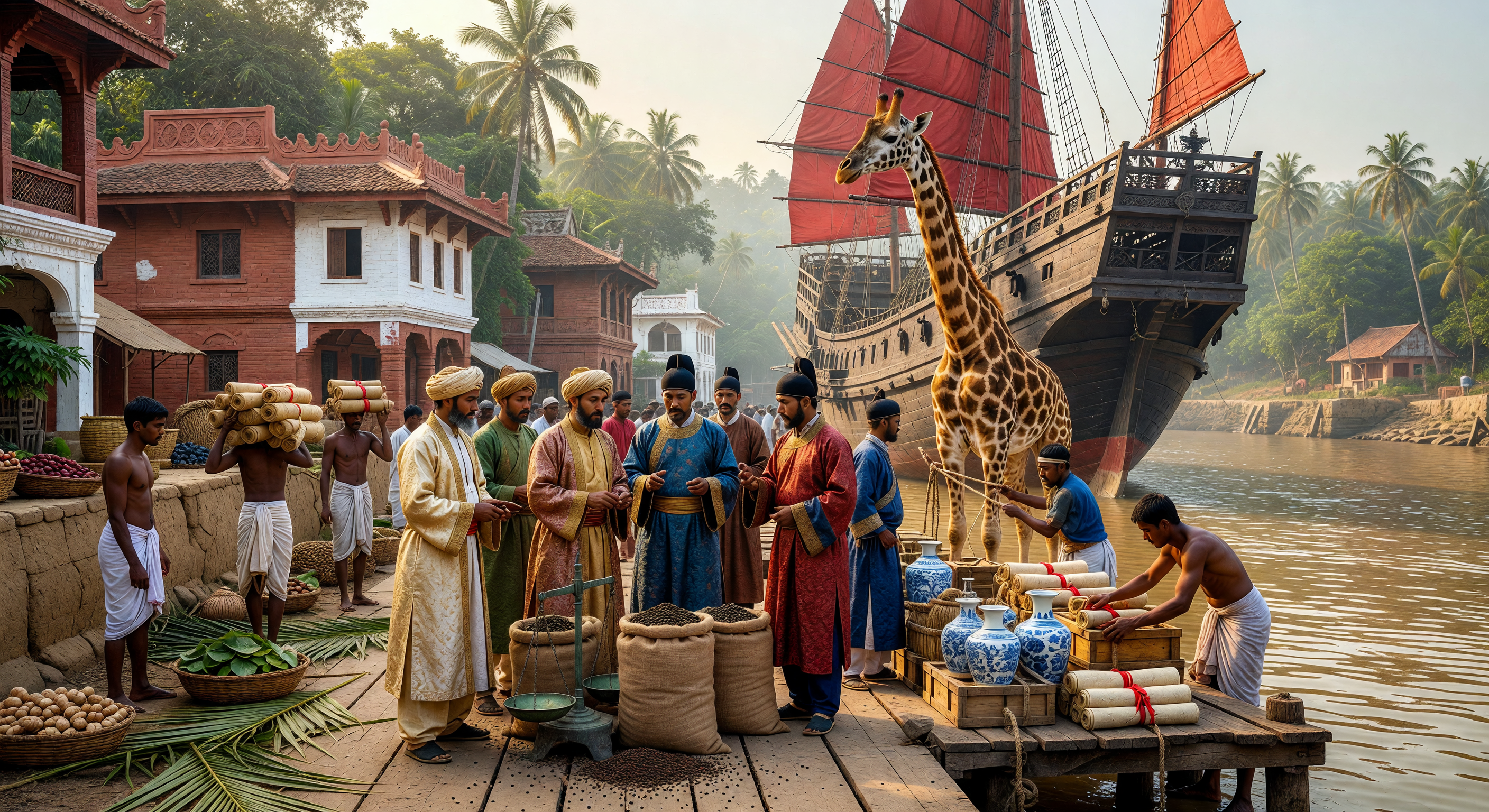 Verdict: adjust for both image and caption. The scene is close enough to the target period and region to preserve, but it needs targeted corrections rather than a full remake. The image should be tightened for ship type, ship scale, architectural chronology, and removal of the anachronistic potatoes; the caption should be softened where it overstates specificity, while preserving the historically defensible core about Bengal maritime trade and the giraffe tribute tradition.