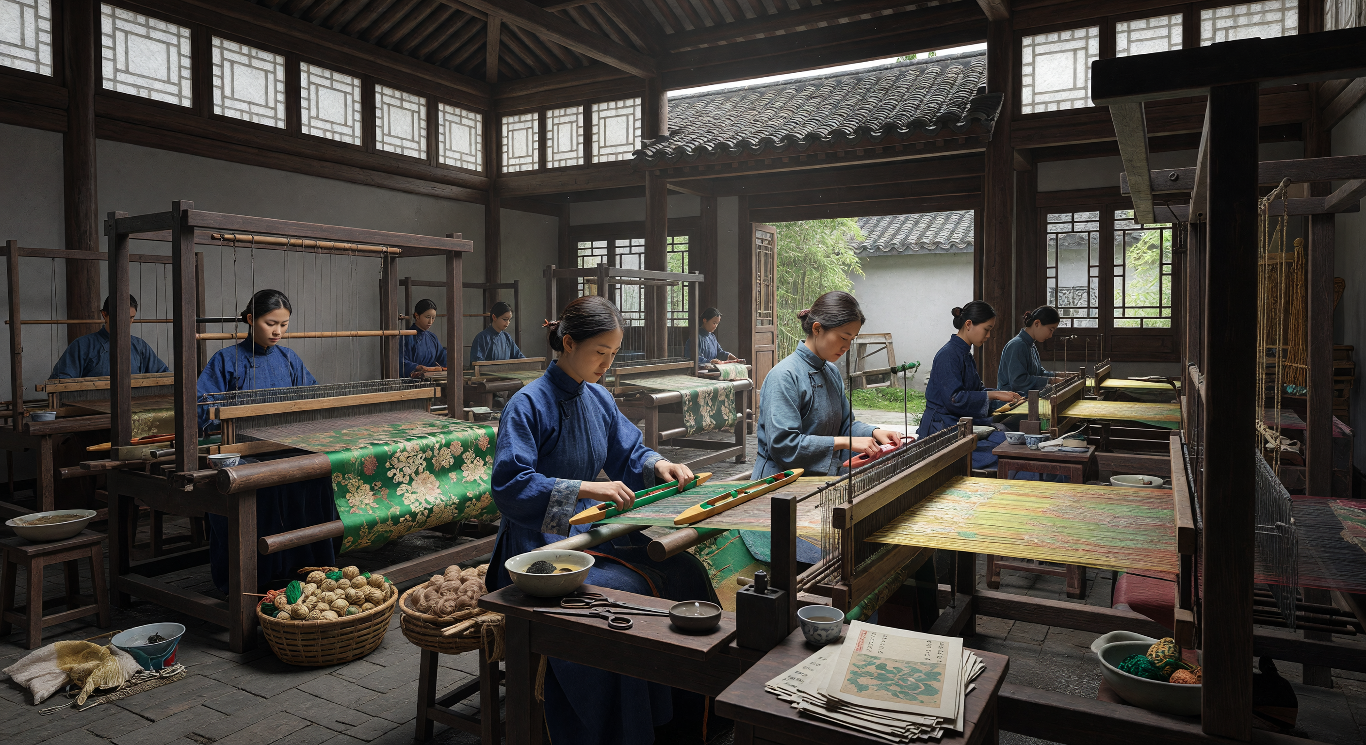 CAPTION: Most claims are accurate—Suzhou was a silk epicenter with hualou drawlooms for damasks, Jiangnan humidity aided production, and 184s luxury trade served court and exports (Opium War era shifted dynamics but didn't end dominance). Female artisans in indigo tunics fit. However, 'massive wooden drawlooms, known as hualou' overstates slightly: image shows plausible multi-person horizontal looms suited for damask (often two-person with pattern mechanisms), but not the distinctly tall, elevated 'flower building' hualou requiring a separate drawboy upstairs—caption's specificity mismatches visible simpler setups. 'Epicenter of global silk production' is hyperbolic; China led but Italy/Lyon competed, and 184s European mechanization loomed. 'Mid-Qing' fits 184s (Daoguang reign), but adjust for precision. Appropriate detail overall, but tweak loom description and soften absolutes. Adjust.