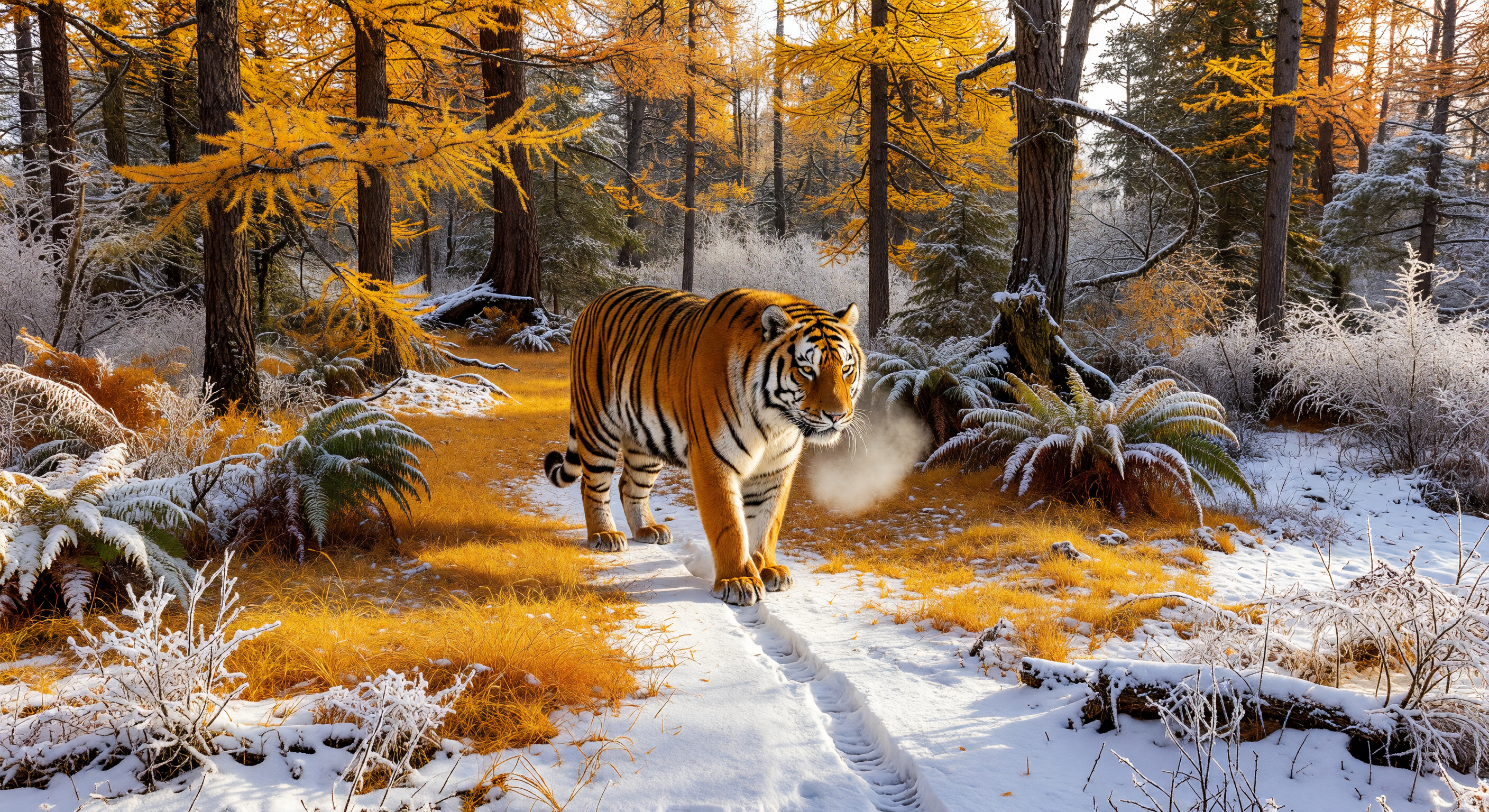 The image successfully captures the core concept: a Siberian tiger (Panthera tigris altaica) in a taiga-like forest setting with snow on the ground and golden larch foliage. The tiger's morphology is convincing — large, heavy-bodied, with the appropriately thick fur expected of the Amur subspecies. The visible breath vapor in cold air is a nice realistic touch. The mixed boreal forest with both deciduous larches and evergreen conifers is botanically plausible for the Amur region. However, the ferns visible in the foreground and midground are problematic — while some fern species do exist in the Russian Far East, having such lush, green ferns alongside fresh snow is unusual and somewhat inconsistent; ferns in this region would typically be thoroughly frost-killed and brown by the time snow is falling. The coexistence of golden larch needles still on the trees and significant snow accumulation also sits in a narrow, transitional window that feels slightly forced, though it is not impossible.