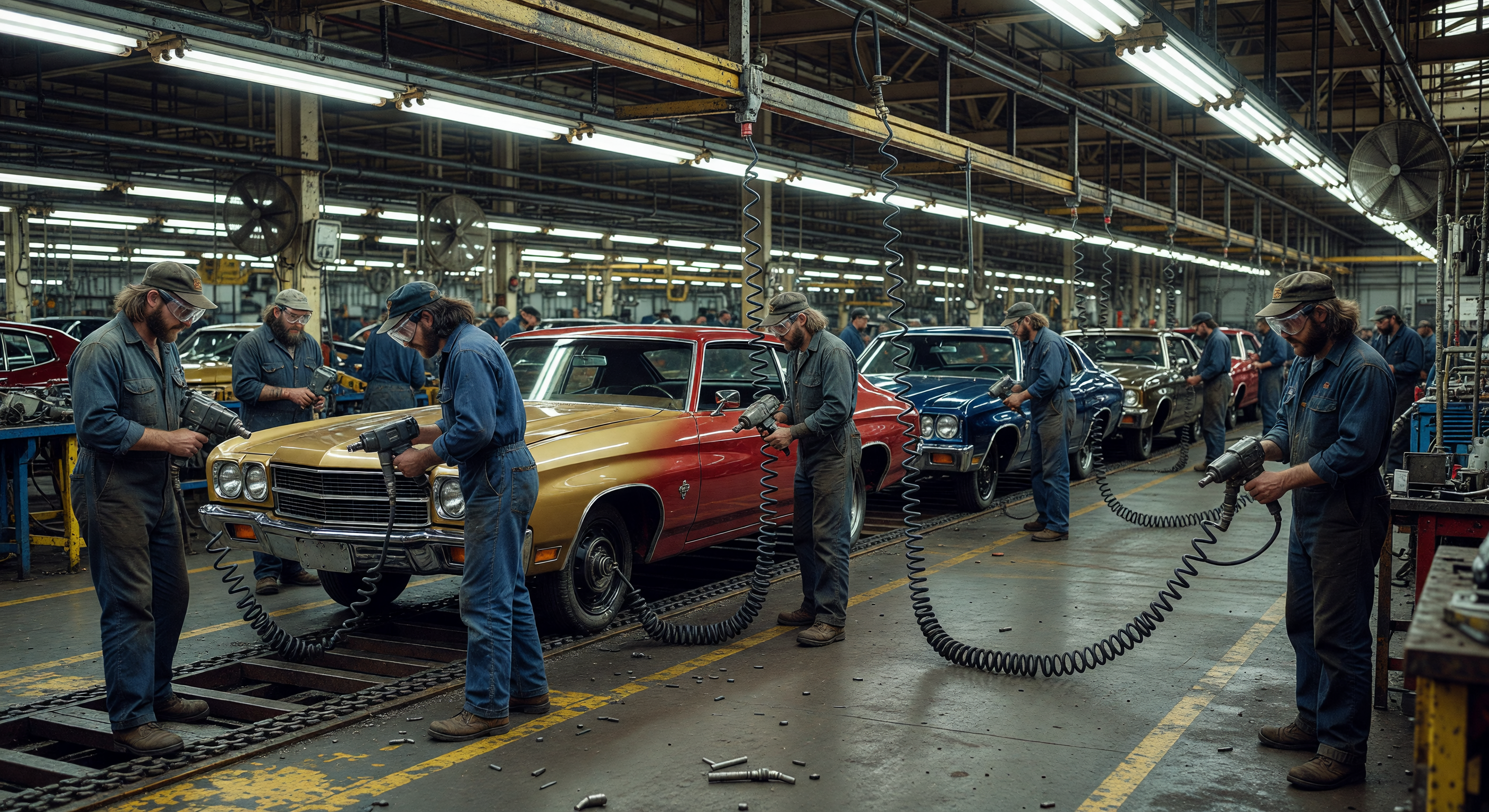 Das Bild erfasst effektiv das visuelle Wesen einer nordamerikanischen Automobilmontagelinie der 197er Jahre, wobei Chevrolet Chevelle-Coupés (197-1972 Styling: ausgeprägte Kühlergrills, Haubenwölbungen, pillarlose Coupés in klassischen Farben wie Gold, Rot und Blau) präzise dargestellt sind. Die Arbeitskleidung – blaue Overalls, Jeans, Arbeitsschuhe, Strickmützen oder Baseballkappen – und die Ausstattung (pneumatische Schlagschrauber, die von aufgerollten Schlauchaufwicklern hängen) entsprechen den Standards von 1972, ebenso wie die industrielle Architektur: freiliegende Stahlträger, Betonböden, kettengetriebene Förderbänder und hängende Neonröhrenbeleuchtung. Es sind keine offensichtlichen Anachronismen vorhanden, und die Szene ist kulturell plausibel für ein kanadisches oder amerikanisches GM-Werk in der Großen Seenregion, mit einer überwiegend weißen männlichen Belegschaft, die die Demografie der damaligen Zeit widerspiegelt. Zu den geringfügigen Problemen gehören jedoch KI-Generierungsartefakte (wiederholte Arbeiterposen, leicht unnatürliche Farbmischungen auf dem Vordergrund-Auto in Gold), und die Montagephase zeigt fast fertige Fahrzeuge (lackiert, mit Rädern, verglast, Türen montiert) anstelle einer frühen Türmontage auf bloßen Chassis oder Karosserien, was die historische Genauigkeit verringert. Diese sind durch verfeinerte Eingaben für frühere Montagephasen und vielfältige Posen behebar.