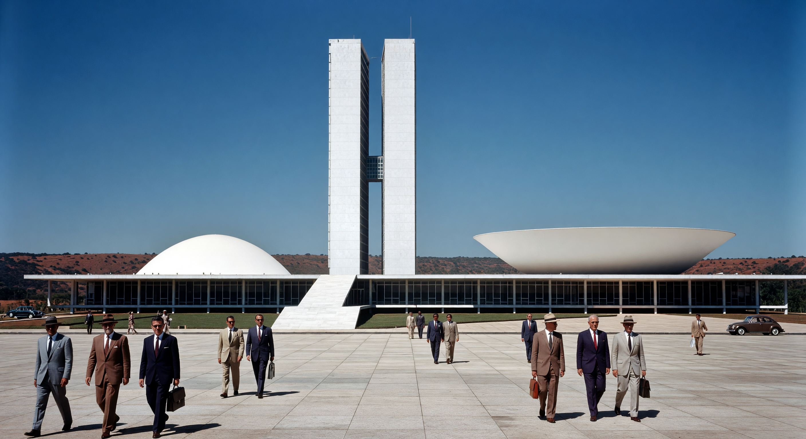 Das Bild fängt hervorragend die Architektur des Nationalkongresses von Brasilien ein, mit den markanten Zwillingstürmen, der konvexen Kuppel des Senats, der konkaven Schüssel der Abgeordnetenkammer und den verbindenden Rampen, die präzise in makellosem weißen Beton gegen den rötlichen Cerrado-Boden und die spärliche Vegetation der brasilianischen Highlands dargestellt sind—perfekt passend zum Erscheinungsbild von Brasília nach der Einweihung 196. Epochenhafte Details wie die schmalen Anzüge mit schmalen Krawatten, Aktentaschen, Fedoras auf einigen Figuren und die klassischen Volkswagen Käfer der 195er-60er Jahre im Hintergrund entsprechen der Ästhetik des brasilianischen Staatsdienstes der Mitte des Jahrhunderts und der Automobilverbreitung. Der weite geometrische Praça dos Três Poderes unter einem klaren blauen Himmel evoziert den markanten, modernistischen Platz. Allerdings weisen die überwiegend weißen, männlichen Figuren eine klonartige Ähnlichkeit in den Gesichtszügen und Posen auf, wodurch die visuelle Kohärenz und Plausibilität verringert werden; während Elitebeamte im Jahr 196 oft europäischer Abstammung waren, rechtfertigt die multikulturelle Gesellschaft Brasiliens (mit afro-brasilianischen, indigenen und mestizen Einflüssen selbst in offiziellen Umgebungen) eine größere demografische Vielfalt für kulturelle Genauigkeit. Keine Anachronismen oder wissenschaftlichen Probleme in Geologie/Landschaft.