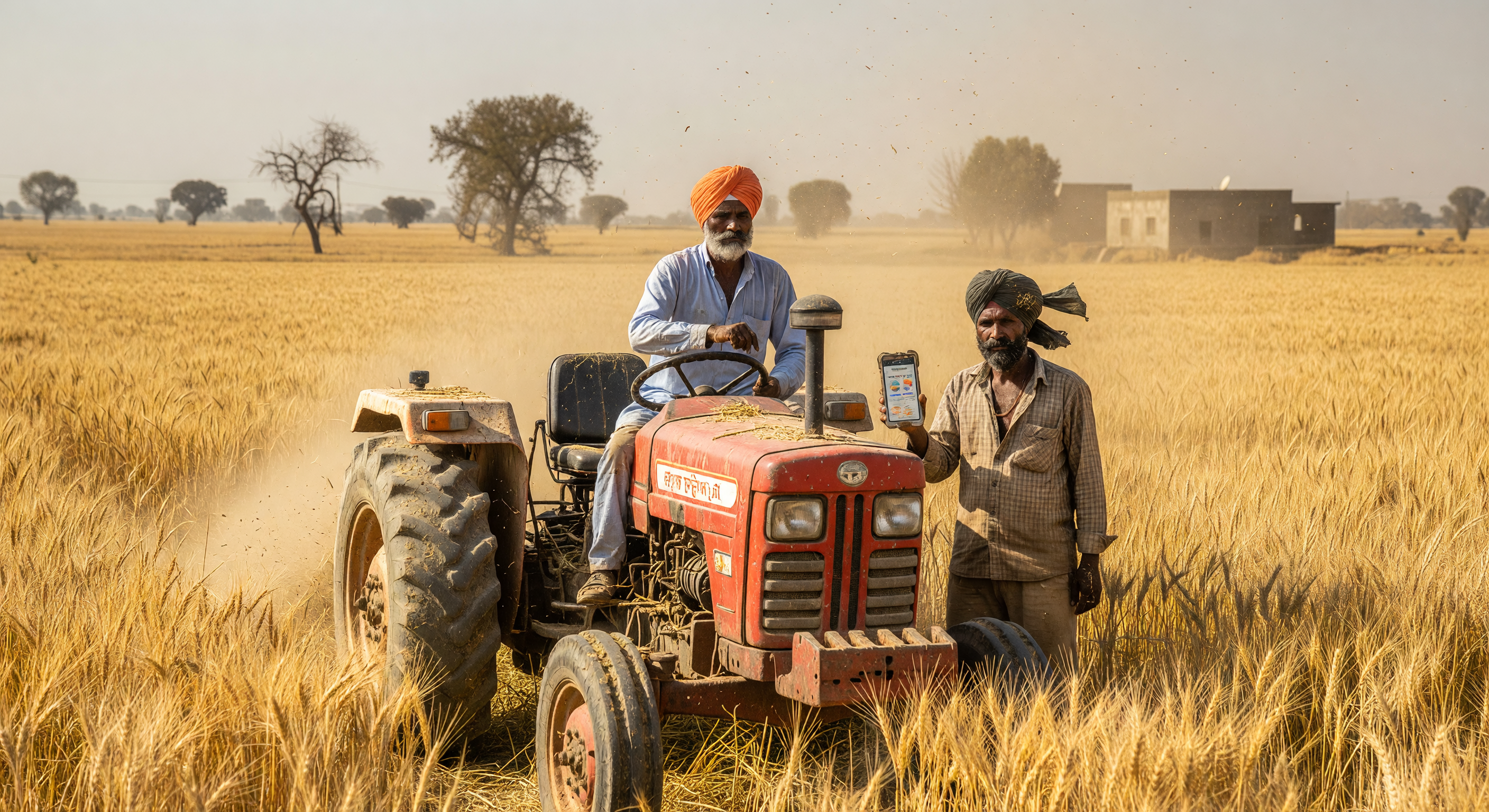 The image is exceptionally strong and highly accurate for the specified period and region. The visual evidence supports the integration of modern technology (smartphone) with established agricultural practices (Mahindra-style tractor, wheat fields) and cultural identity (Sikh attire). The presence of what appears to be Gurmukhi script on the tractor, as noted by a previous reviewer, significantly enhances regional authenticity. The visual elements are scientifically and culturally sound for rural Punjab in the Digital Age.