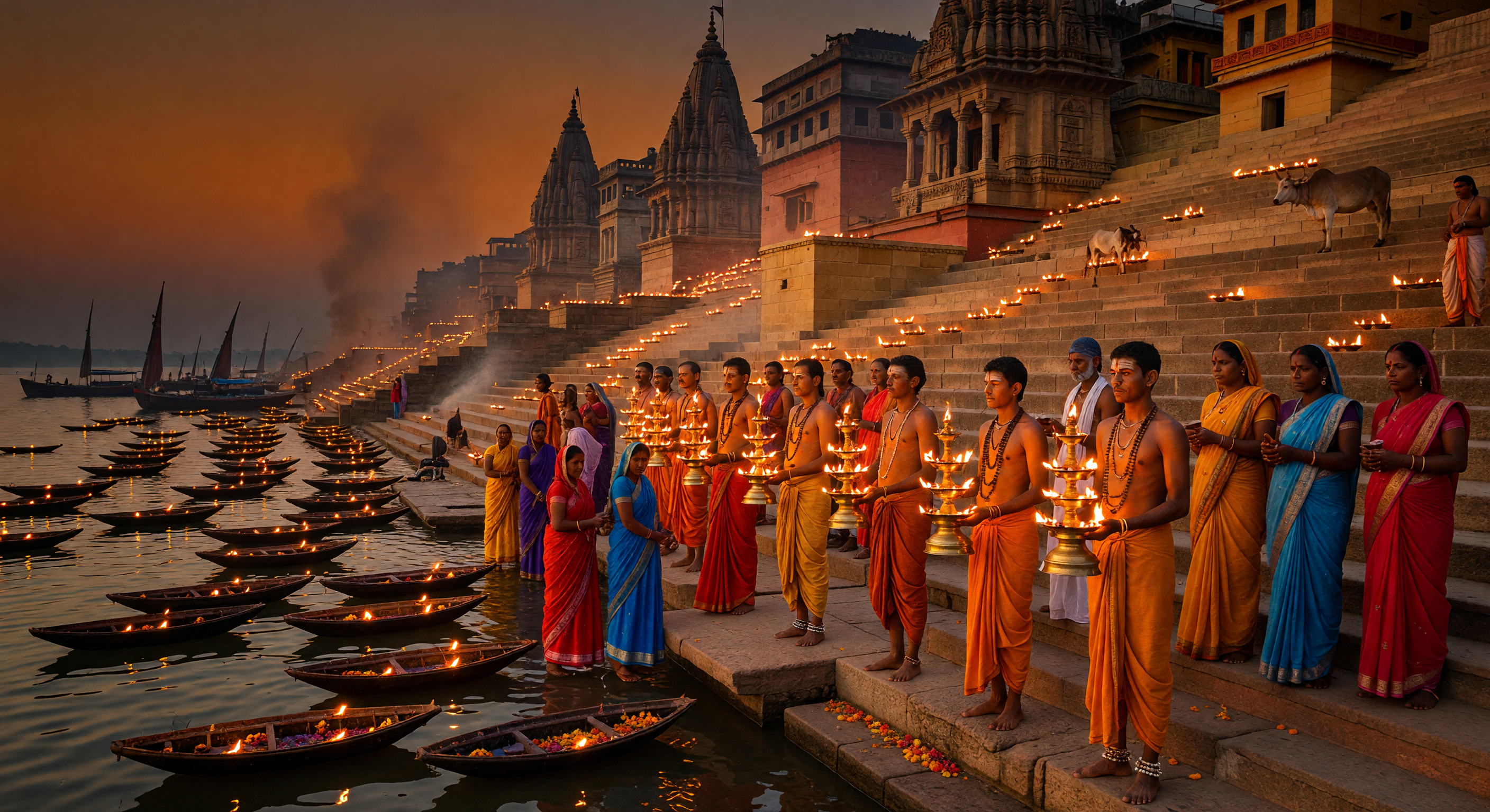 The image captures the essential atmosphere of a Ganga Aarti ceremony convincingly: priests in saffron/orange dhotis hold multi-tiered brass lamps, pilgrims in colorful saris observe, and the stepped ghāt stretches along the riverbank with Nagara-style temple shikhara silhouettes visible in the background. The sacred cow on the steps is a culturally appropriate detail. The evening lighting and fiery orange sky create a plausible ritual atmosphere. However, several elements raise concern for a late 17th-century historical depiction: the architecture in the background, particularly the multi-story structures visible on the right, has a somewhat modern/colonial appearance with flat facades and structured balconies that feel more 19th-20th century than Mughal-era Varanasi. The boats on the river appear to be standard wooden rowboats rather than the leaf-boats or diya floats described in the caption — this is a significant discrepancy with the caption's description of 'leaf-boats,' which the caption's previous reviewer also flagged correctly.