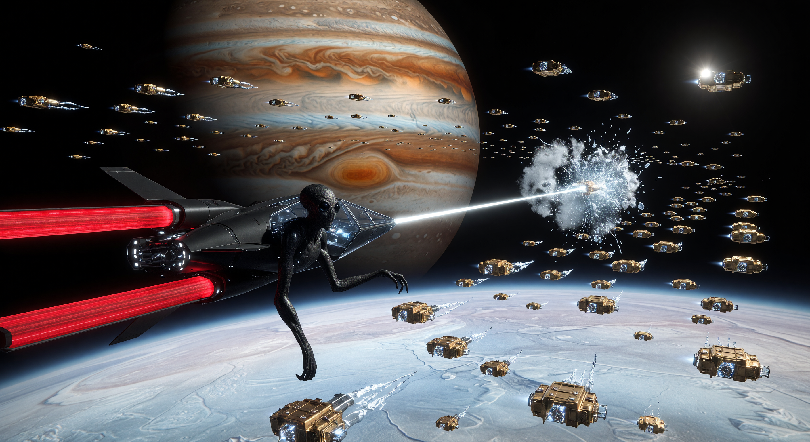 Paragraph 1: The committee broadly agrees that the image is a coherent far-future sci-fi battle scene and that several core elements are visually supported: a dark preservationist vessel, a vacuum-adapted litho-sapient-looking pilot, a directed-energy beam, a swarm of modular drones/ships, and a Jovian backdrop with an icy moon-like foreground. There is also general agreement that the image and caption are trying to depict an orbital conflict in the Jovian system during a speculative high-energy interstellar era.