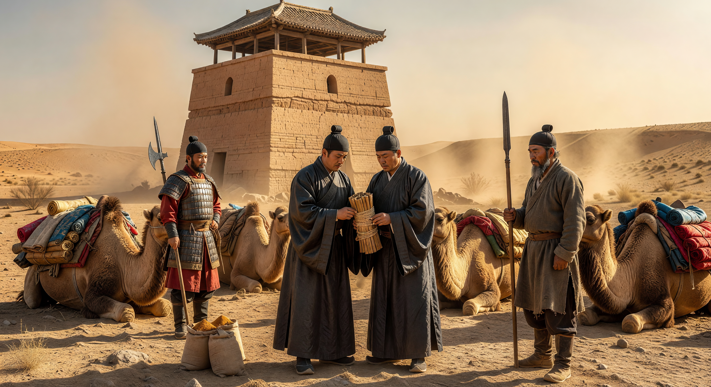 For the caption: the broad idea—Han frontier administration interacting with Central Asian merchants over Silk Road routes near Dunhuang—is broadly compatible with late 2nd-century corridor activity. However, several claims are overstated or insufficiently supported by the image. “Sogdian merchant” is specific and not visually corroborated; while Sogdians were indeed active along the Silk Road (especially in later periods and more commonly associated with west-to-east trade across Central Asia), the caption should be careful about tying a particular ethnicity to a particular Han outpost without stronger contextual or visual evidence. The “meticulously inspect wooden ledger slips” claim is also not clearly represented: the officials appear to inspect bundled items rather than identifiable wooden slips. The “massive rammed-earth watchtower” element is directionally plausible, but “massive” and “vital link” are interpretive rather than evidence-based, and could be softened.
