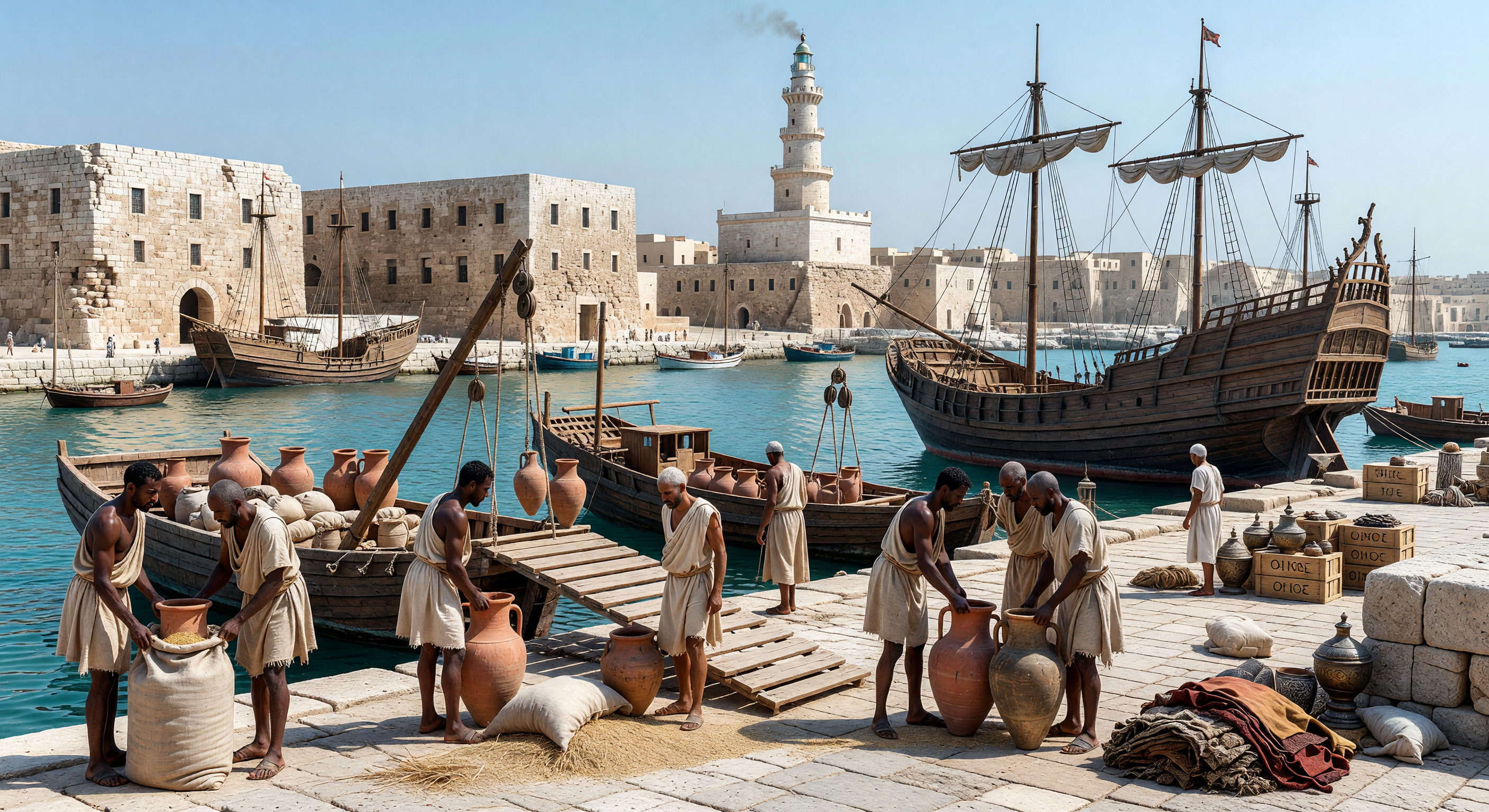 The image depicts a bustling harbor scene with laborers in tunics unloading amphorae and grain sacks from ships onto stone quays, which aligns broadly with Late Antique trade activities. The diverse workforce (including figures with North African and Mediterranean features) and cargo types (amphorae, wheat) are culturally plausible for 4th-century Alexandria. Limestone architecture and a lighthouse in the background evoke the Pharos, and the overall composition is visually coherent and plausible as a busy port. However, significant anachronisms demand 'regenerate': the prominent ship on the right has a lateen sail rig, tall masts, and hull shape resembling 15th-16th century Mediterranean galleons or caravels, not Roman-era naves onerariae with square sails and simpler rigging. The lighthouse resembles the medieval Qaitbay Fort or a minaret rather than the ancient Pharos's multi-tiered tower. Wooden ramps/pallets and crate handling appear modern. No legible text issues visible, unlike colleagues' notes, but these flaws make the scene historically implausible overall.