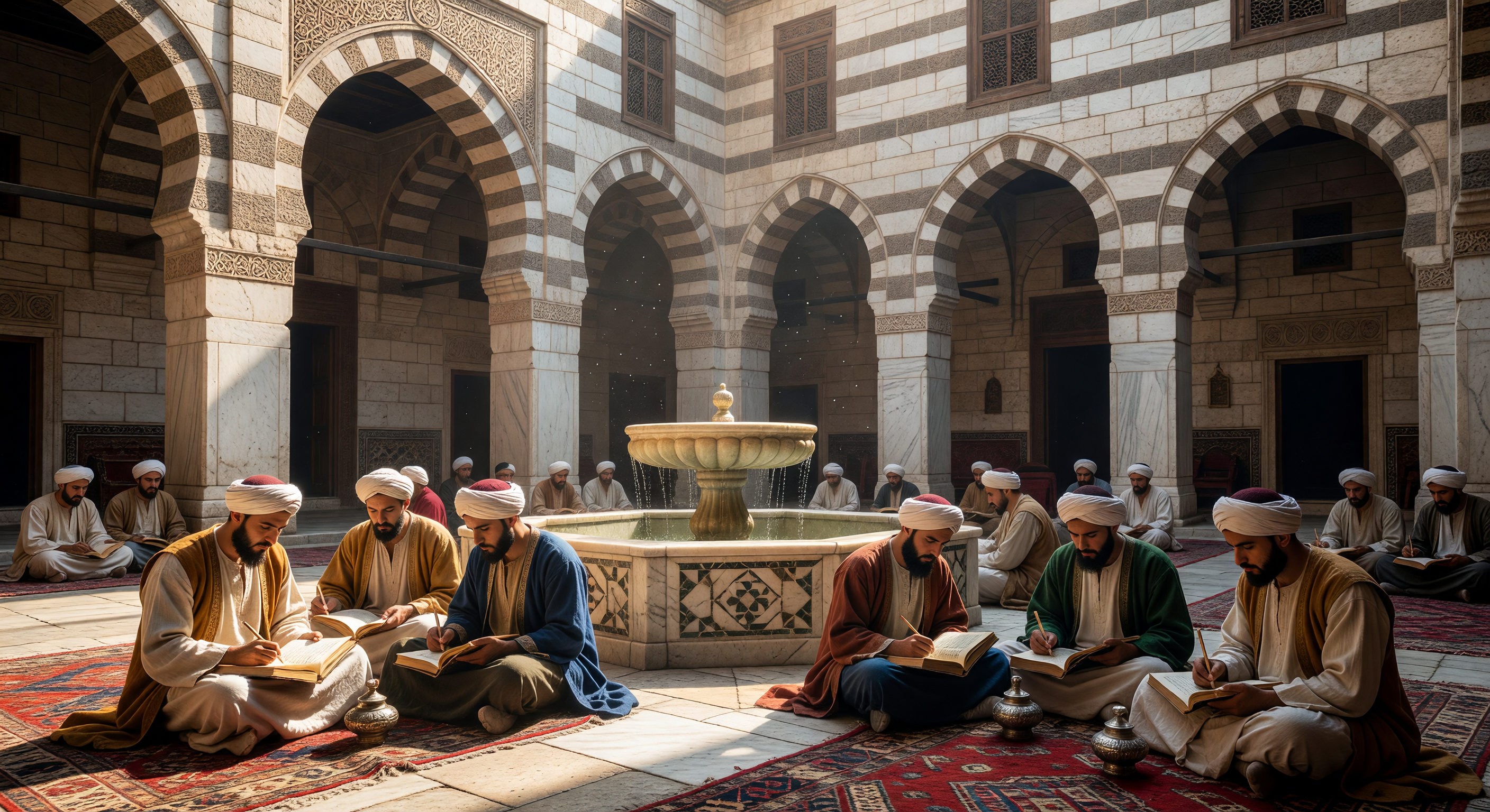 Este patio de una madrasa mameluca del siglo XIV en El Cairo muestra a estudiantes sentados sobre alfombras de lana, rodeados por la emblemática mampostería *ablaq* de franjas blancas y negras y una fuente central de mármol. Los jóvenes, vestidos con caftanes y turbantes tradicionales, se dedican al estudio y la caligrafía con cálamos de caña, ilustrando el papel crucial de estas instituciones como centros de saber en el Egipto medieval. La escena captura la intersección entre la arquitectura monumental y la vida académica cotidiana, donde la luz del sol resalta las texturas de la piedra tallada y los intrincados motivos geométricos de las celosías.