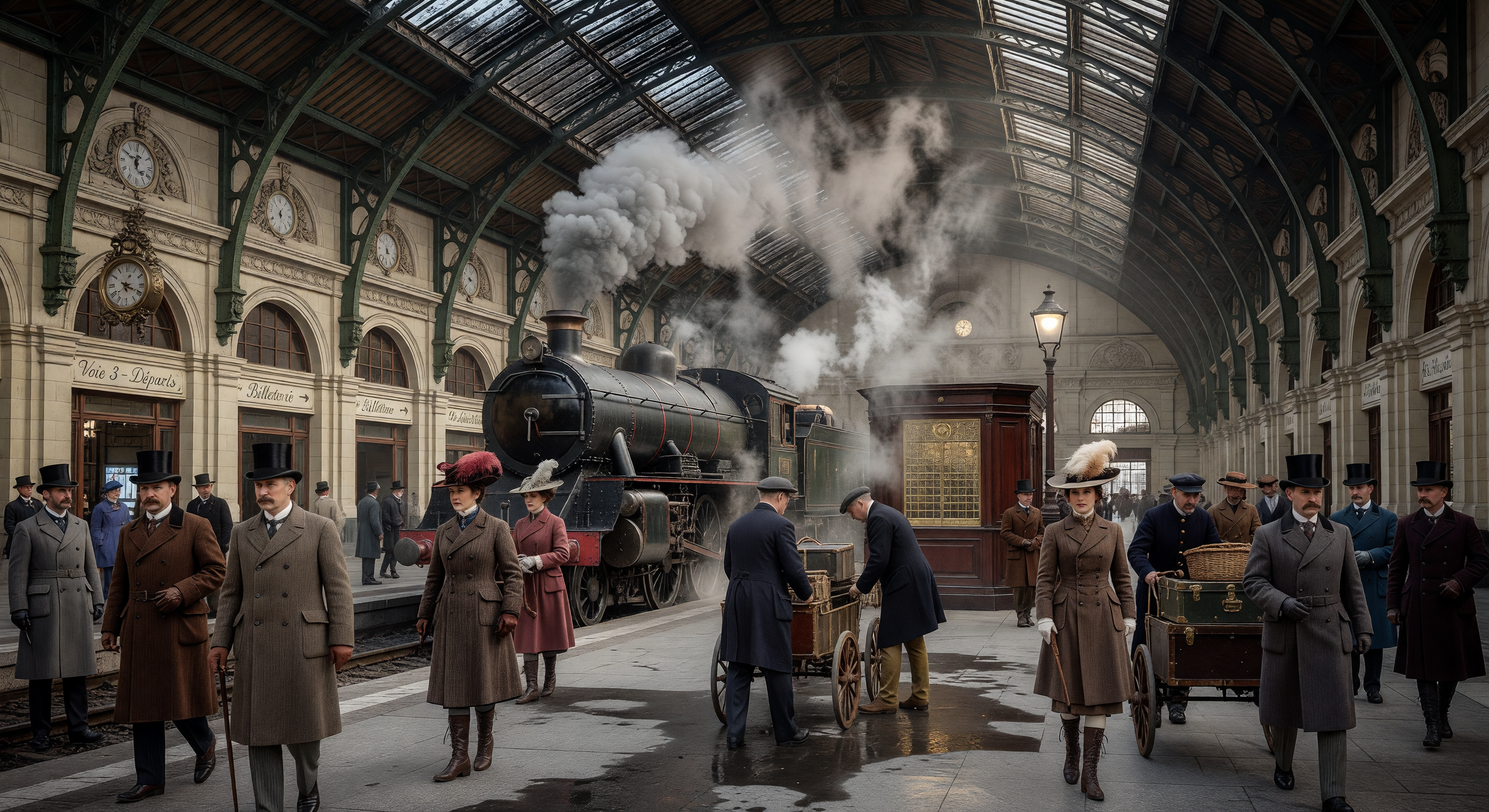 Una imponente locomotora de vapor emerge entre nubes de hollín bajo la majestuosa estructura de hierro y cristal de una terminal europea de principios del siglo XX. En el andén, la sofisticada silueta de la burguesía con sus abrigos de lana y sombreros de copa contrasta con el ajetreo de los mozos que cargan pesados baúles de cuero sobre el granito pulido. Esta estampa de la Belle Époque ilustra la revolución del transporte ferroviario, un pilar de la modernidad que transformó radicalmente el paisaje social y arquitectónico de las grandes metrópolis antes de 1914.