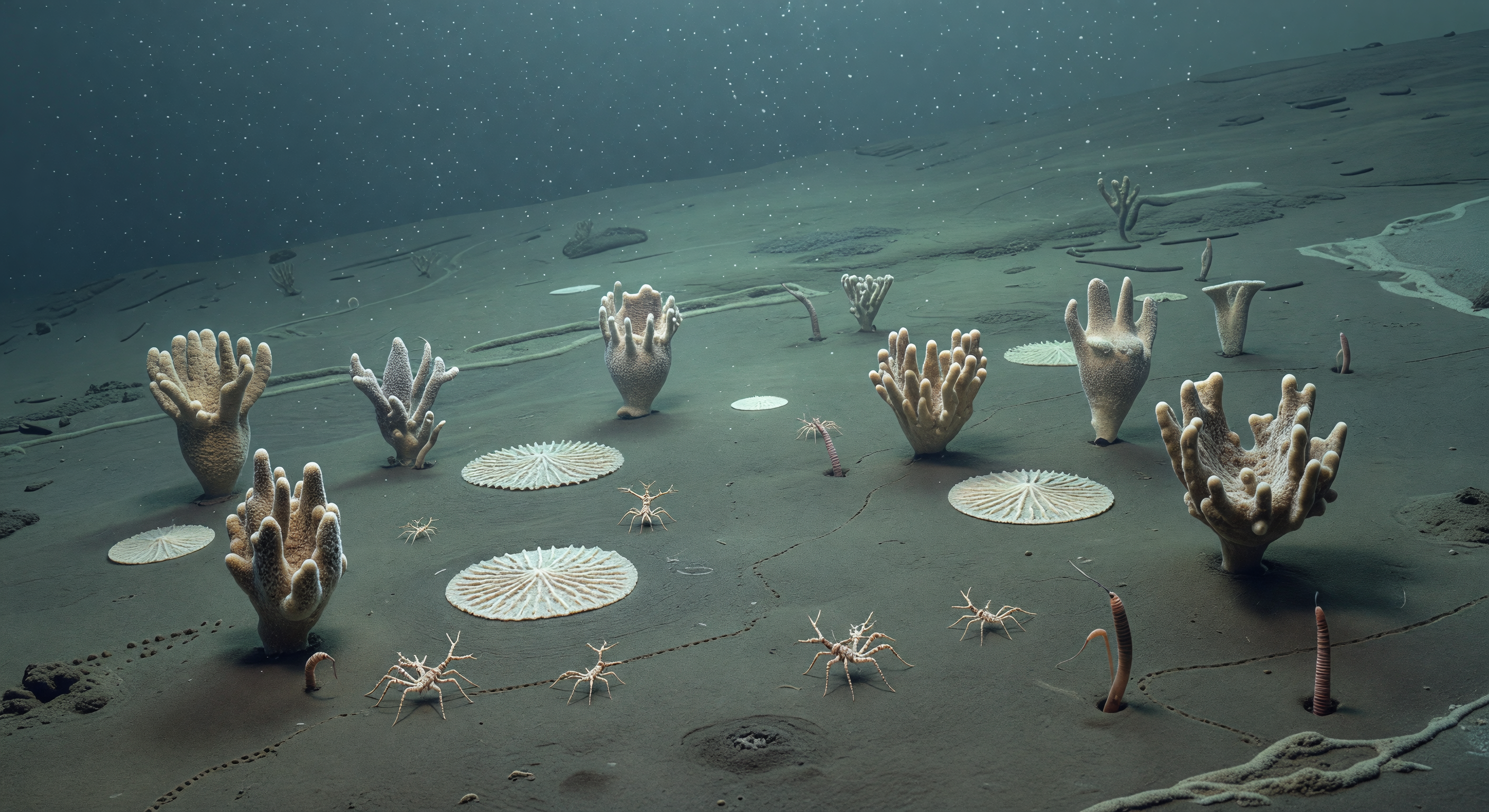 La imagen transmite con éxito la atmósfera general de un fondo marino cámbrico tenue y silencioso, con sedimento fino, partículas orgánicas en suspensión y una comunidad bentónica escasa, todo ello apropiado para un entorno de plataforma externa del tipo Burgess Shale. Las estructuras planas, radiales y discoidales sobre el fondo marino son una aproximación razonable de las esponjas Choia, que tenían un cuerpo discoidal con espículas radiantes, aunque el patrón radial aquí resulta algo demasiado regular y ornamental. Los organismos vermiformes que emergen del sedimento constituyen una representación aceptable de Ottoia, mostrando cuerpos anillados que sobresalen de madrigueras, aunque se beneficiarían de un mayor detalle anatómico, como la probóscide característica con ganchos. La paleta cromática general y la iluminación se ajustan bien a un ambiente marino situado por debajo de la zona fótica.