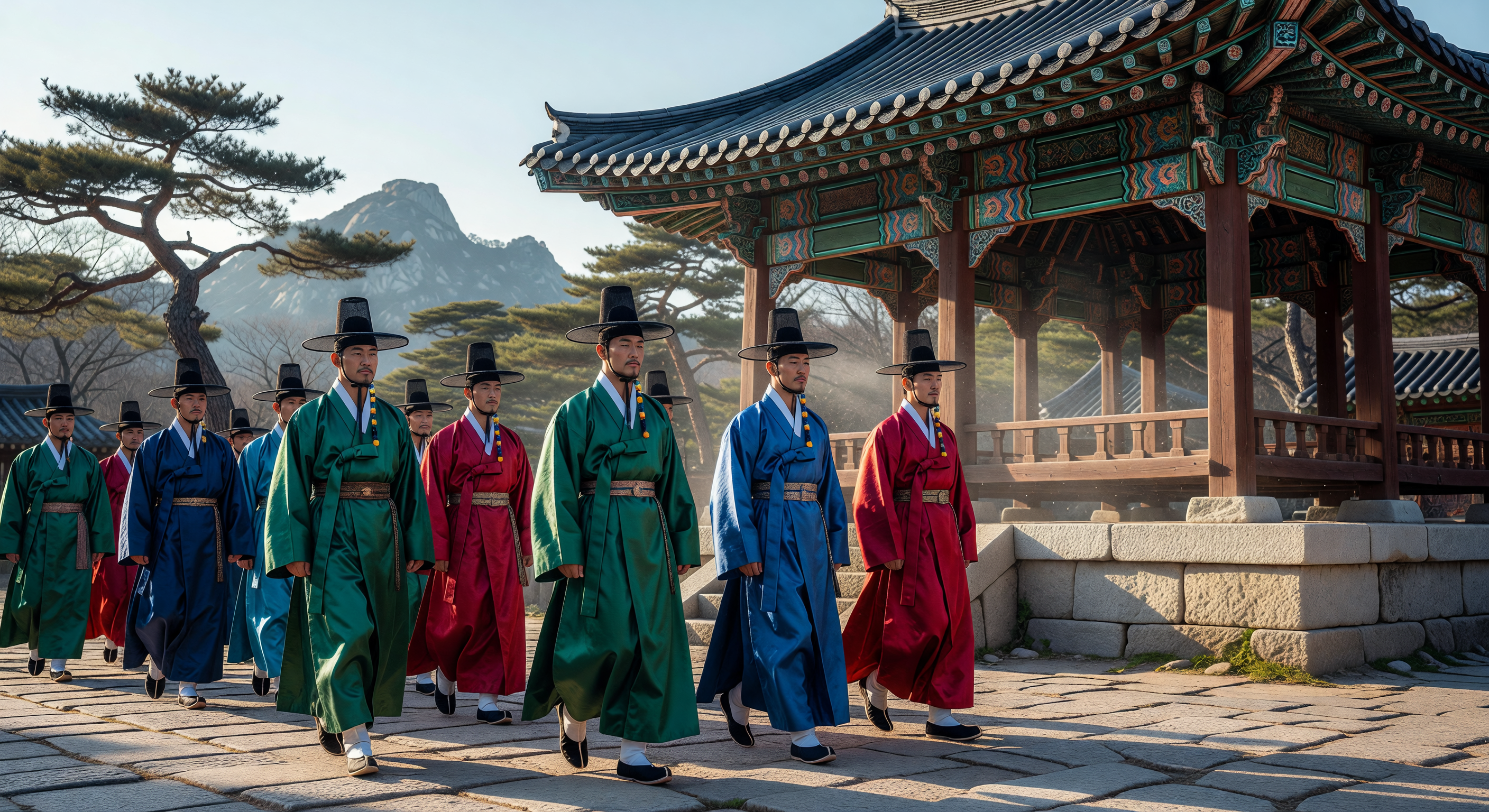 The image captures many convincing elements of late Joseon Korea: the stone-paved courtyard, the pavilion with dancheong-painted bracketing in green, red, and blue geometric/floral motifs, the upswept giwa tile roofline, the background granite mountains and Korean pine trees (Pinus densiflora), and the procession of men in what are recognizably hanbok robes with gat-style black hats. These elements collectively place the scene credibly in Joseon-era East Asia. However, several issues warrant adjustment rather than outright regeneration. The gat hats are rendered too solid and opaque — authentic gat were notably translucent, woven from fine horsehair and bamboo, giving them a distinctively light appearance that is absent here. The robes' color combinations (wearing both a green outer robe over red, or blue over red simultaneously) look more like a ceremonial performance costume or modern re-enactment than strict period attire, where layering conventions were more regulated. The belts/sashes appear somewhat generic and lack the specificity of joseon accessories. The pavilion is structurally plausible but its open gazebo form (jeongja) is more associated with garden leisure than formal processions, creating a slight contextual mismatch.