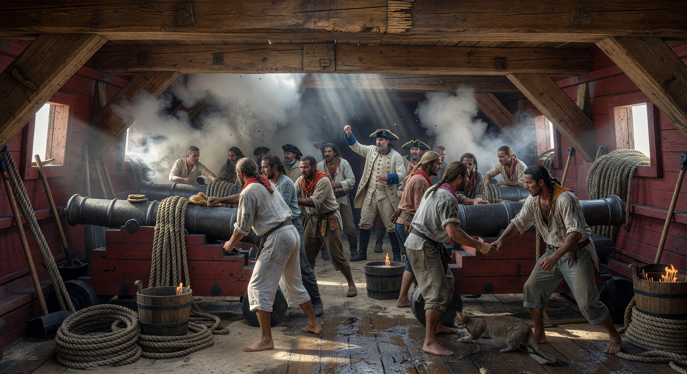 The image effectively captures the claustrophobic, smoke-filled atmosphere of a mid-18th-century ship of the line's lower gun deck, with accurate wooden beam architecture, low ceilings, red ochre-painted walls (consistent with documented French naval practice), heavy cannons on naval carriages, coiled ropes, gunpowder barrels, and period clothing like loose shirts, trousers, neckerchiefs, and an officer's tricorne with blue cuffs. Barefoot crew is historically correct for grip and spark prevention, and the dynamic action amid smoke is visually coherent and plausible for a naval engagement. However, minor issues persist: the firing buckets show open flames rather than safe slow-match cords in lidded tubs (a real safety risk and inaccuracy), cannon details lack visible breeching ropes/train tackles for full operational fidelity, and the small dog (not a cat as prior reviews noted) on deck is plausible as ship's mascots were common but slightly distracts without clear historical tie-in; the overly dramatic lighting feels cinematic. These are fixable with prompt tweaks, warranting 'adjust' over 'approve'.