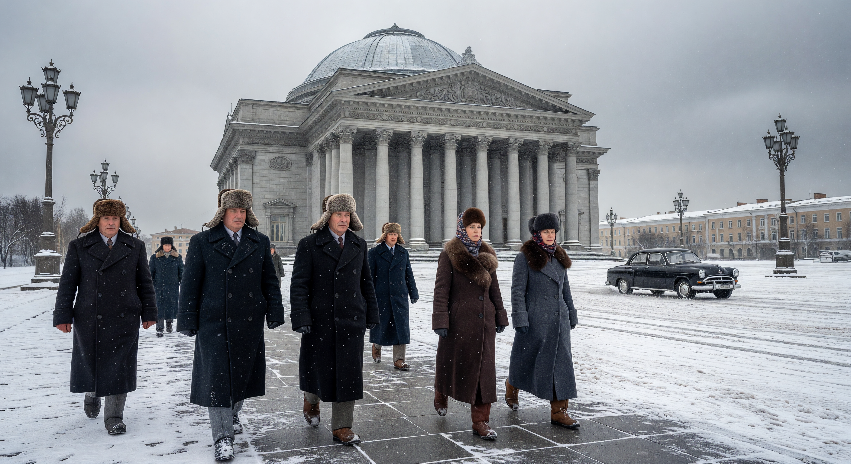 La imagen presenta una escena generalmente convincente de la Siberia soviética de los años 50, con ropa de invierno apropiada que incluye ushankas de piel, abrigos de lana gruesa y lo que parece ser un sedán oscuro de la época en el fondo. El estilo arquitectónico evoca el neoclasicismo estalinista con su masiva columnata y cúpula. Sin embargo, hay varios problemas que vale la pena señalar. El edificio representado no coincide estrechamente con el Teatro de Ópera y Ballet de Novosibirsk, que tiene una cúpula plateada distintiva y una relación proporcional diferente entre su columnata y su cúpula. El edificio en la imagen se asemeja más a una estructura neoclásica genérica, algo reminiscentede del Panteón o un compuesto de varios edificios de la era soviética. La plaza frente al edificio parece excesivamente limpia y moderna en su patrón de pavimentación, y las farolas ornamentadas de múltiples brazos parecen algo anacrónicas para la configuración de Novosibirsk de mediados de la década de 195, pareciendo más características de una renovación urbana posterior o de una ciudad completamente diferente. Los rostros de las personas y su apariencia general tienen una cualidad extrañamente moderna; los peinados y rasgos faciales de las mujeres parecen más contemporáneos que los de las soviéticas de mediados de los años 50. La leyenda menciona las botas valenki, pero el calzado visible en los peatones parece ser botas de cuero en lugar de las distintivas valenki de fieltro.