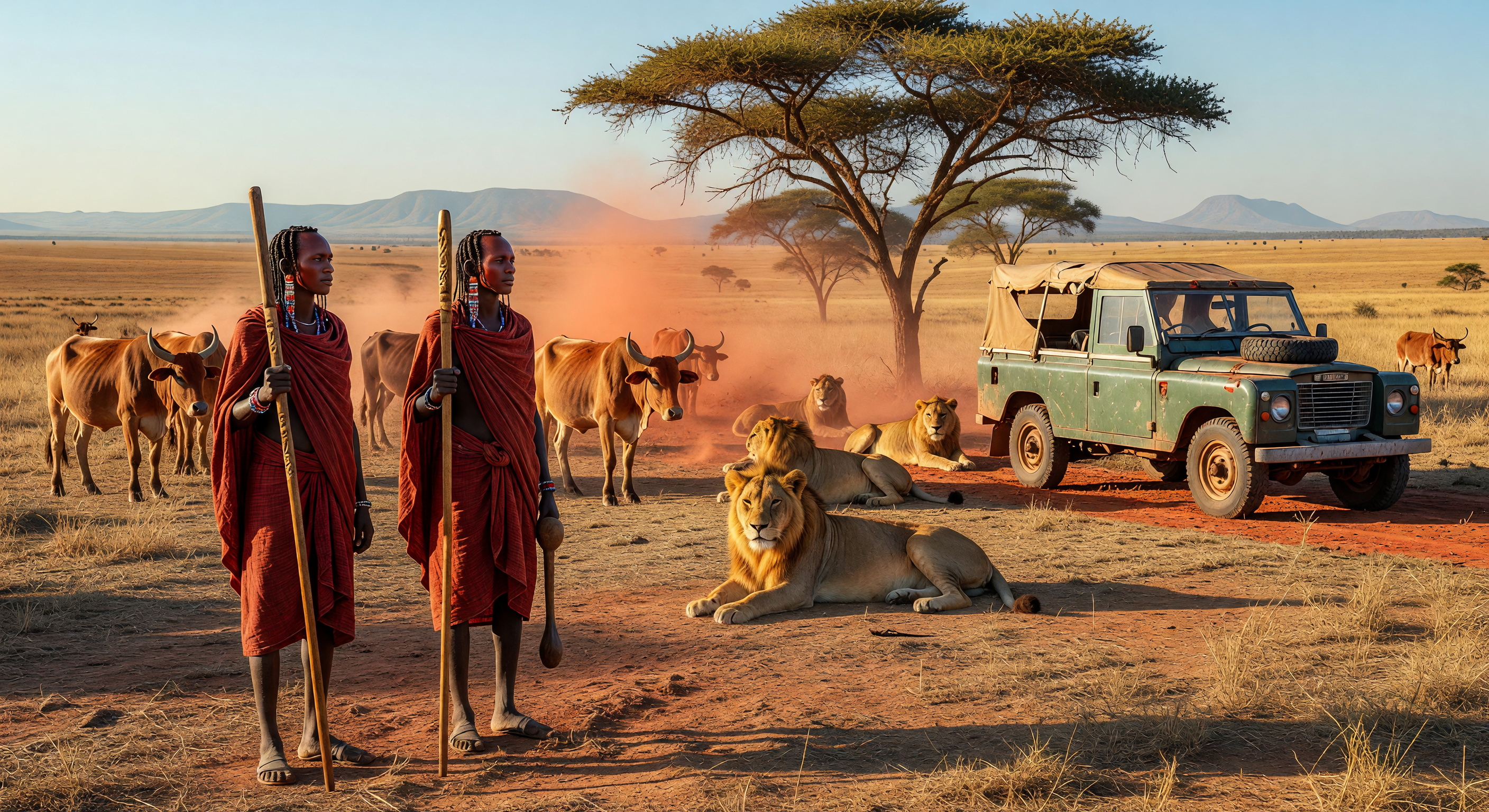 La imagen captura bien muchos elementos: el paisaje del Serengeti con árboles de acacia de copas planas, gramíneas de sabana dorada, colinas distantes y suelo rojo laterítico son todos geográficamente apropiados. Los morans maasai se representan con shukas de ocre/rojo oscuro, joyería de cuentas, cabello trenzado, bastones y sandalias de neumáticos, todos culturalmente plausibles. El Land Rover parece ser un modelo de la serie consistente con la época de principios de los años 60, completo con un techo de lona para safari y una apariencia adecuadamente desgastada. Sin embargo, hay problemas de plausibilidad notables: leones descansando calmadamente a solo metros de ganado cebú y pastores maasai es altamente poco realista. Los leones son depredadores ápice del ganado, y el conflicto entre maasai y leones sobre el ganado es una de las tensiones definitorias de esta región. Ningún moran maasai se mantendría tranquilo con el ganado mientras los leones se relajaran a unos pocos pies de distancia — esta escena representaría una crisis inmediata, no un tableau pastoral. El ganado en sí también parece notablemente tranquilo dado la proximidad de los depredadores. Esta elección compositiva socava la credibilidad de la imagen como una escena histórica realista.