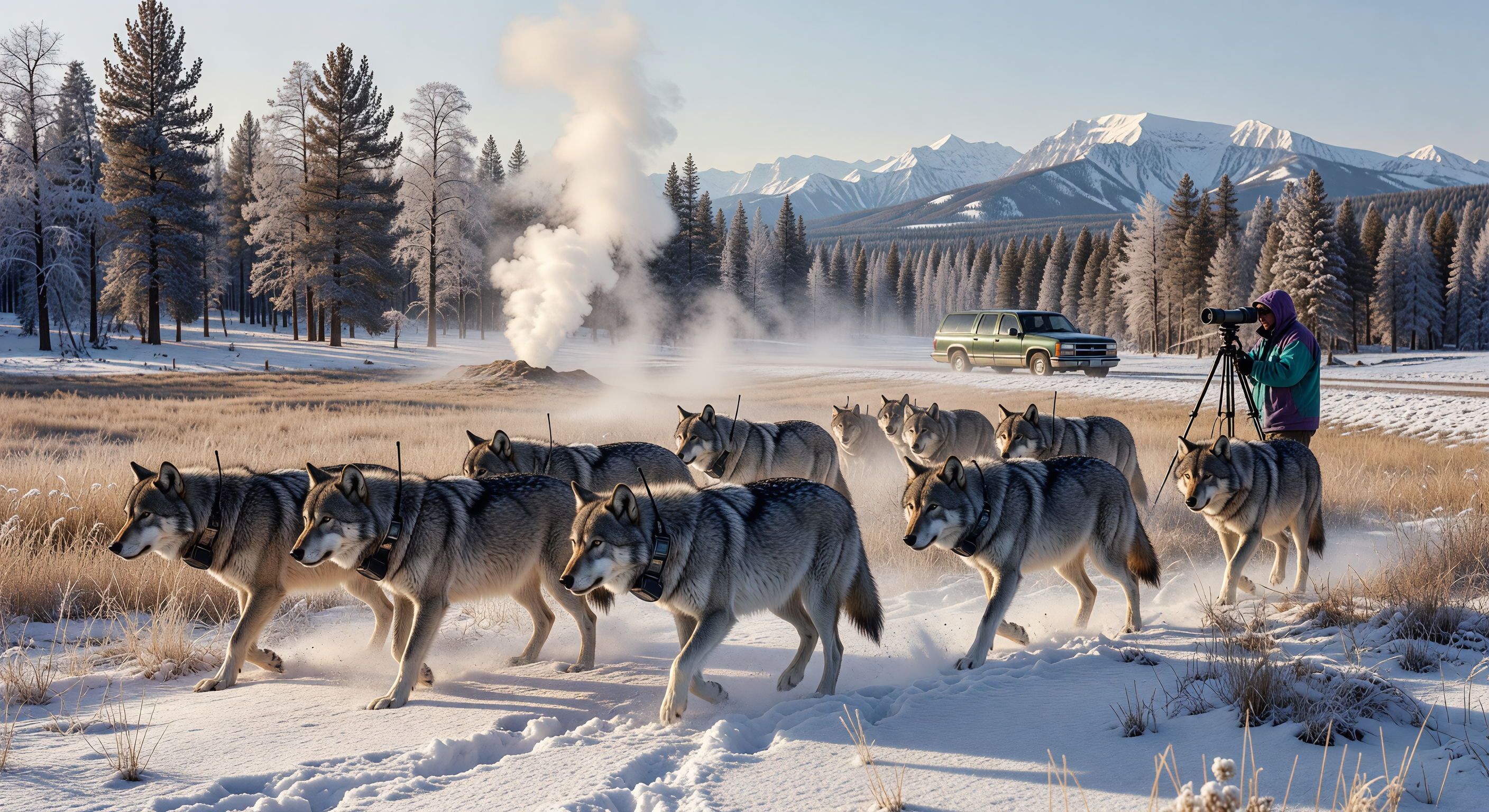 La imagen captura con éxito la esencia ambiental del Valle Lamar de Yellowstone, incluida la actividad geotérmica y el vehículo y el telescopio apropiados de la década de 199. Sin embargo, la imagen requiere ajustes para abordar varias inexactitudes científicas e históricas. Si bien los lobos viajan en fila india por la nieve para conservar energía, la representación aquí padece de uniformidad en la inteligencia artificial; los lobos parecen casi clones con un espaciado y posturas idénticas, lo que carece de variación natural. Además, la representación de cada lobo en la manada con un collar radio es históricamente inexacta. Durante la reintroducción de 1995, los biólogos generalmente solo colocaban collar a la pareja alfa o a algunos sub-adultos dispersantes por manada, no a todo el grupo.
