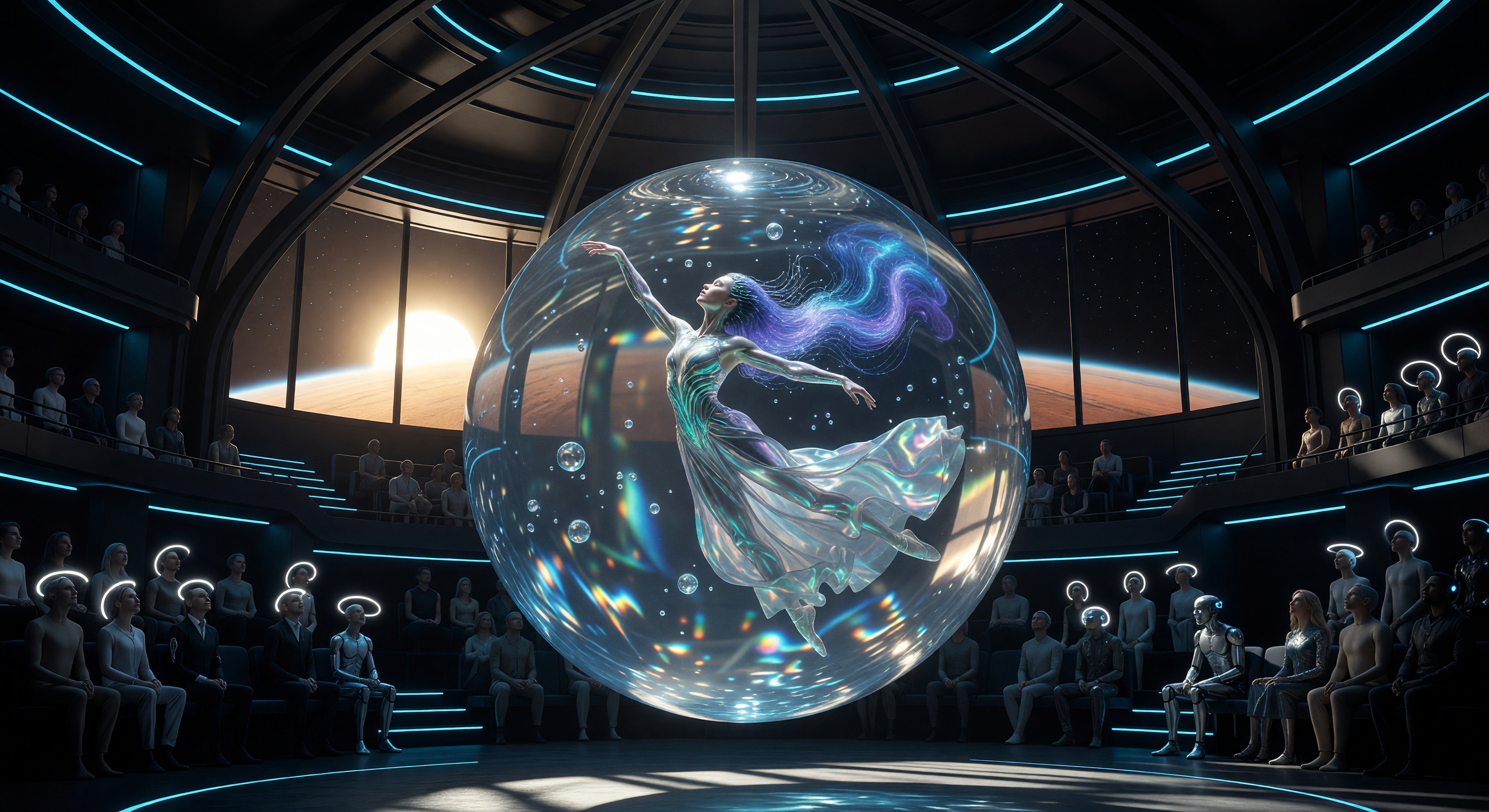 The image is visually compelling and broadly consistent with the 2500–3000 CE Solar Expansion period. The translucent sphere containing the dancer, the iridescent flowing garments, the tiered futuristic theater, and the mixed audience of apparent post-humans and synthetic beings all cohere well with the caption's described aesthetic. The exterior viewport is particularly noteworthy: it clearly shows a reddish-brown planetary surface with a horizon curve and what appears to be a sun or bright star, which does suggest a Martian orbital setting. This is actually a stronger Mars visual cue than GPT acknowledged—the rust-orange coloration of the planetary surface is quite distinctive and consistent with Mars, though the atmosphere appears perhaps too thick/blue for early-stage terraforming, which would present a thinner, pinker atmosphere.