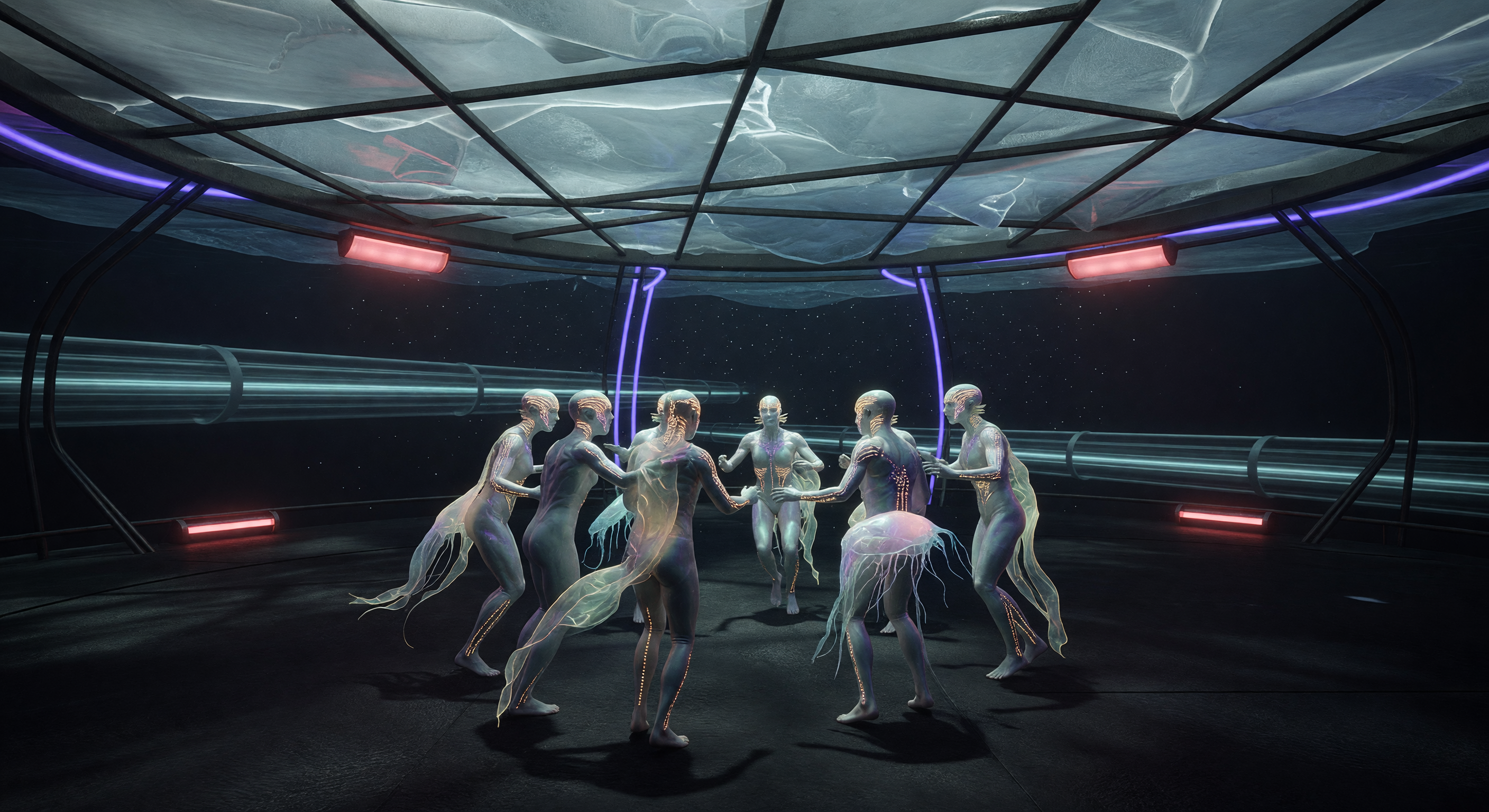 The image effectively captures a speculative aquatic habitat on Europa with a striking ice ceiling featuring stratified cracks and metallic suspension framework, evoking the 15km-thick ice shell. The Aquamorph figures are visually coherent and scientifically plausible for genetic adaptation: iridescent, bioluminescent skin with glowing patterns suits light-pulse communication in low-light deep ocean conditions, while elongated lower bodies with fin-like tails and gill-like neck structures align with high-pressure aquatic locomotion and liquid respiration. The dark, enclosed plaza with neon-red accents and tubular conduits suggests a vibrant social gathering powered by advanced tech, and the overall aesthetic avoids overt anachronisms for a 250-300 AD far-future setting. However, key adjustments are needed for plausibility: figures appear to stand/walk on a solid floor in a low-gravity, air-like medium rather than buoyant, liquid-filled high-pressure brine (no visible water distortion, bubbles, or constrained movement), and the background through walls hints at void/space rather than murky ocean depths, undermining the sub-surface setting. Minor refinements to prompt for explicit liquid medium, ocean vista, and cryogenic/radiation-shielded engineering would fix these without a full redo.