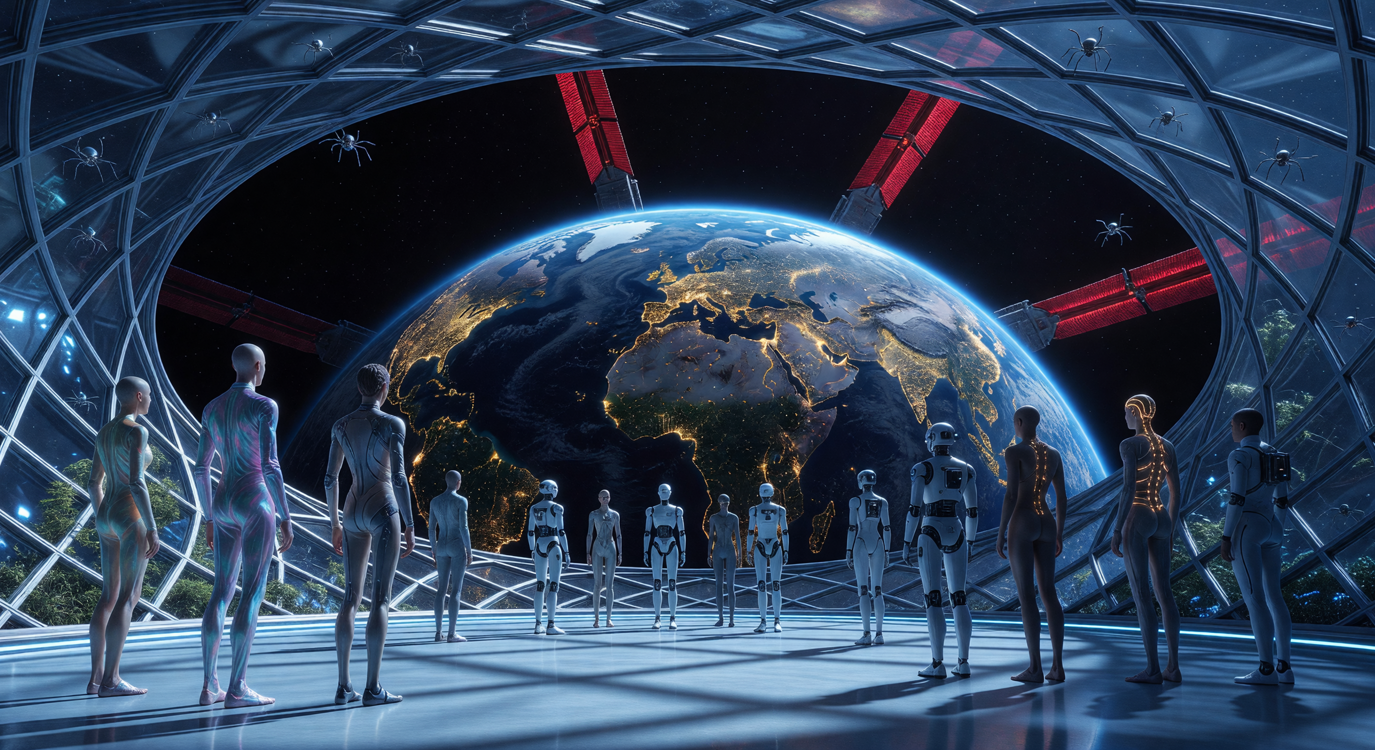 La imagen capta de manera efectiva una escena orbital especulativa del año 2144 d.C. con una fuerte coherencia visual y plausibilidad. La plaza de observación de vidrio-diamante se representa como una estructura de enrejado geodésico con paneles transparentes, integrando vegetación para una sensación de hábitat, lo que se alinea con la arquitectura orbital avanzada. Figuras humanoides alargadas y delgadas a la izquierda y en el centro representan plausiblemente a humanos adaptados a la gravedad, sus altas estaturas y sutil brillo metálico sugiriendo refuerzos de titanio en un contexto de baja gravedad. Figuras robóticas blancas coinciden con los SIM Proxies, mientras que algunos humanos muestran un trazado neural radiante adecuado para individuos aumentados. La destacada vista de la Tierra representa realísticas luces de ciudades del lado nocturno (redes doradas sobre África/Europa/Medio Oriente) contra un fondo oscuro de océano/terreno con un límite atmosférico azul preciso y una sutil iluminación del lado diurno, evitando anacronismos. Vigas rojas brillantes que se extienden hacia la Tierra evocan radiadores o elementos de Anillo Orbital, realzados por pequeños drones para un detalle tecnológico. No hay imposibilidades científicas; biología (evolución posthumana), astronomía (Tierra desde 400 km) e ingeniería son futurísticamente sólidas.