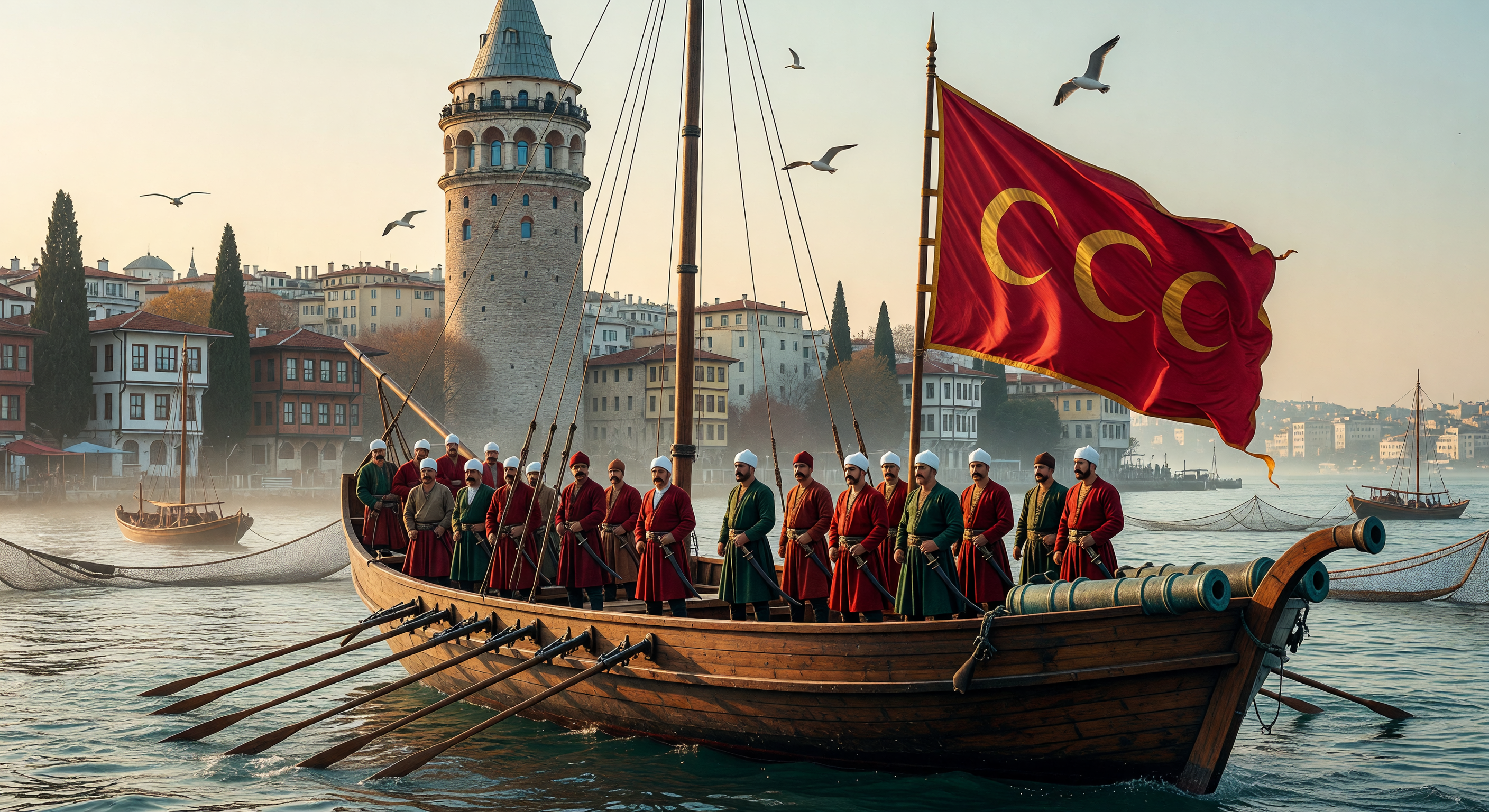 Una esbelta galera *kadirga* de la Armada Otomana surca las aguas del Cuerno de Oro bajo la imponente silueta de la Torre de Gálata, símbolo del dominio imperial en el siglo XVI. En su cubierta, una compañía de jenízaros ataviados con sus distintivos tocados *börk* de fieltro blanco custodian la embarcación, armados con mosquetes y sables *kilij* que reflejan la luz del amanecer. Esta escena captura el esplendor del "Siglo de Oro" otomano, cuando su poderío naval y su sofisticada organización militar convirtieron a Estambul en el epicentro comercial y cultural entre Oriente y Occidente.