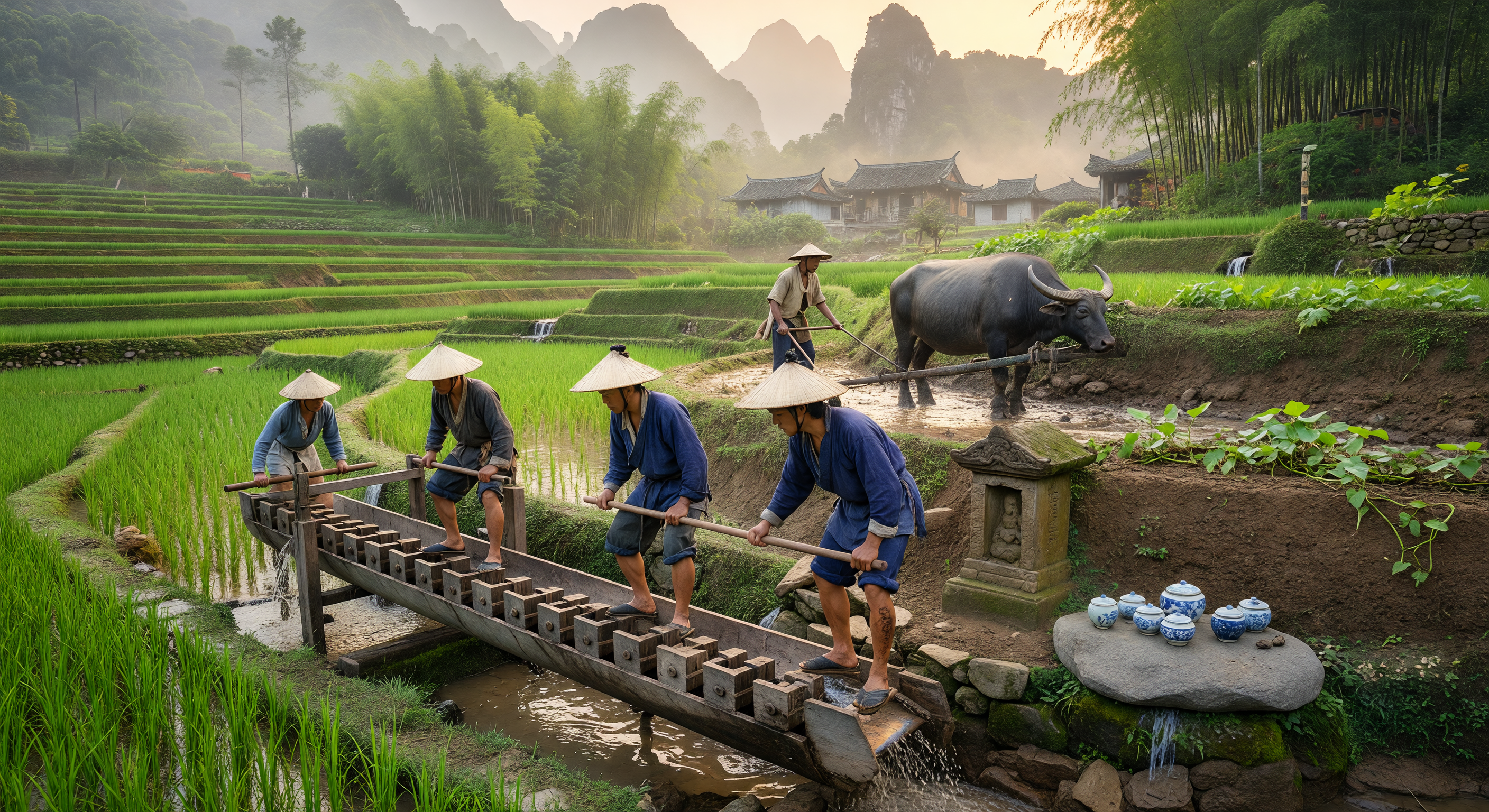 The image effectively captures a plausible late Ming Dynasty agricultural scene in southern China, with terraced rice paddies, karst mountain backdrops (evocative of Guangxi or Guizhou), bamboo groves, and a water buffalo plowing— all geographically and culturally appropriate for the region and period. The central element is a wooden chain-paddle water-lifting device (fānchē or 'dragon-bone water wheel'), operated by four workers on a bridge-like frame, which is historically accurate for Ming irrigation technology and visually coherent. Clothing consists of short blue tunics and loose pants suitable for laborers, with indigo dye plausible for hemp fabrics. However, adjustments are needed for minor inaccuracies: the broad conical hats (nón lá style) lean more Vietnamese than Han Chinese (Ming peasants typically wore douli or simpler bamboo hats); the foreground stone lantern and blue-and-white porcelain vessels evoke Japanese gardens or elite aesthetics rather than everyday farm settings, introducing cultural anachronisms; hillside plants are vague greens, not clearly identifiable as sweet potato vines. No major anachronisms or scientific issues; visual coherence is strong.