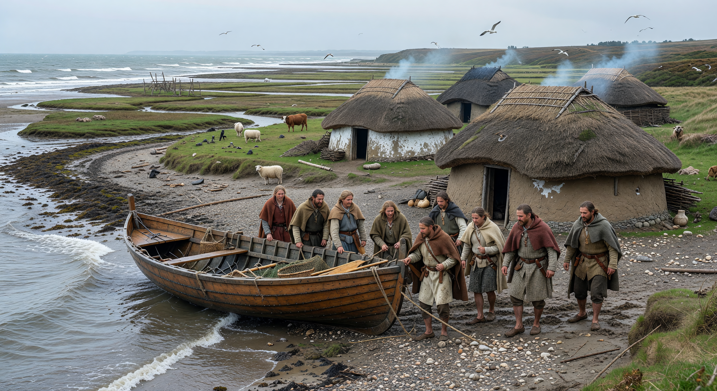 The image captures a plausible Iron Age coastal scene in northwestern Europe around 700–500 BC: a tidal Atlantic estuary with mudflats, saltmarsh vegetation (reeds, grasses), grazing cattle and sheep, seabirds, overcast weather, and thatched roundhouses with smoke from hearths, evoking mixed farming-maritime life. Clothing—heavy wool cloaks, tunics, leather belts, and bare feet—aligns well with archaeological evidence from sites like Flag Fen or Atlantic roundhouse settlements. The shell-strewn foreshore and practical hauling pose add authenticity. However, the roundhouses' bright white plaster walls are problematic; Iron Age structures in this region (e.g., Celtic oppida precursors or Breton/Norman sites) typically featured wattle-and-daub or turf with earthen tones, not limewash, which appears more Romano-British or later. The boat's lapstrake planking suggests Viking-era clinker construction (post-500 AD), not the dugout, skin, or sewn-plank vessels evidenced for early Iron Age estuaries (e.g., Ferriby boats are Bronze Age, but Atlantic small craft were simpler). No overt anachronisms like metal tools are visible, and the landscape/geology (tidal flats, dunes) is scientifically accurate for Pleistocene-Holocene coastal dynamics, but these elements need refinement for precision.