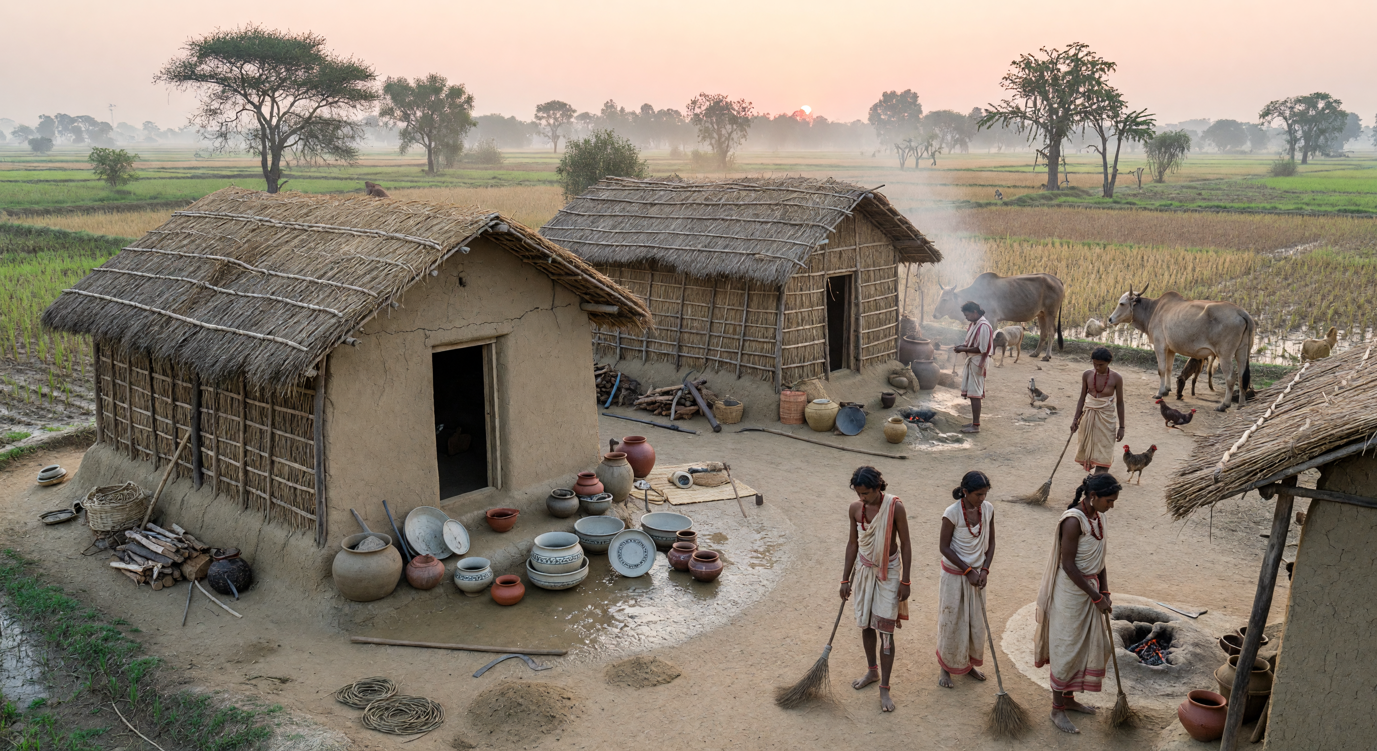 The image effectively captures a plausible early Iron Age village scene in the upper Ganga plain: wattle-and-daub houses with thick thatch roofs, mud-plastered courtyards being swept at dawn, zebu cattle (humped), goats, and chickens are all archaeologically attested for PGW settlements like Hastinapura or Ahichatra (c. 900–700 BC). The landscape with scattered acacia-like trees, misty fields, and sunrise lighting fits the Doab region's semi-arid to alluvial ecology, and the pottery assemblage—fine grey bowls amid coarser red wares—is a strong match for PGW material culture, with visible geometric banding approximating black-painted designs on thin grey ware. Clothing (simple draped white garments on men and women) is culturally appropriate for Vedic-era Kuru-Pañcāla communities, avoiding overt anachronisms like stitched cloth. Visual coherence is high, with coherent scale, activity (sweeping, tending fire/animals), and no glaring modern intrusions like plastic or machinery. Minor adjustments needed: no clear iron tools (e.g., axes, sickles) despite Iron Age context; fields show rice paddies, but PGW agriculture emphasized wheat/barley with rice secondary/later; add diagnostic iron implements and shift fields to dry/stubble crops for precision.