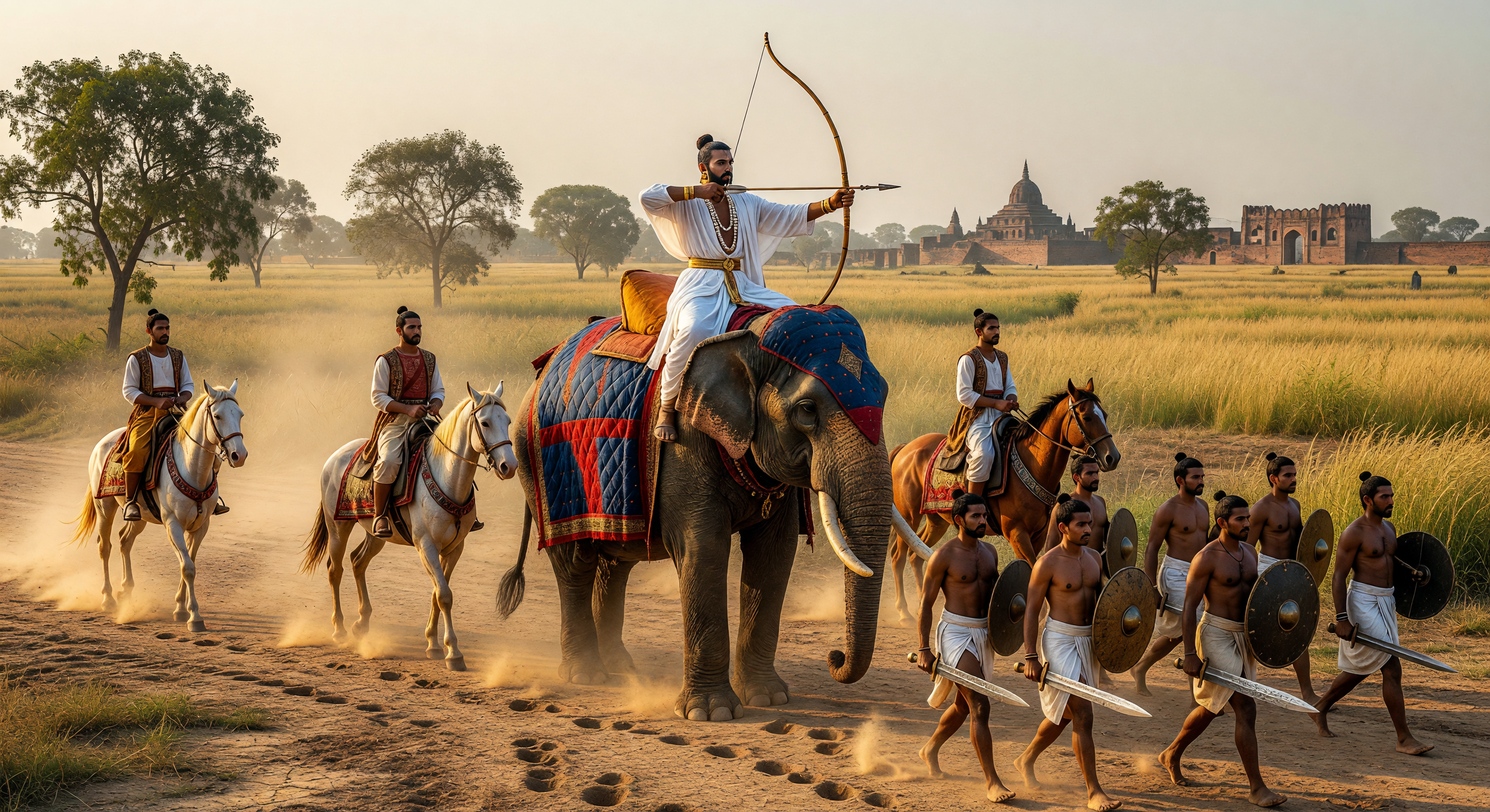 The image effectively captures a plausible Late Antiquity South Asian military procession in the Gangetic plains: the flat, grassy landscape with tall fields, scattered trees (likely peepal or neem-like), dusty golden-hour lighting, war elephant with caparisoned howdah, light cavalry on horses, and minimally clad infantry align with 5th-century Gupta-era aesthetics and environment. The soldiers' white dhotis, bare chests, jewelry, and spears/shields evoke indigenous South Asian warrior tropes, while the central archer on the elephant drawing a longbow adds dynamism. Scientifically, the flora (tall grasses, trees) and fauna (Indian elephant, horses) are accurate for the region, with no glaring geological or biological issues. However, adjustments are needed for the background architecture—a silhouetted stupa-like structure (Buddhist dome) and brick fortifications resemble post-Gupta or even early medieval forms (6th-8th century) rather than the flatter-roofed, modest Gupta temples; infantry shields appear generically round and convex (possibly Greco-influenced but not distinctly South Asian dhal precursors); the elephant's blue/red quilted caparison is visually striking but leans decorative/modern; and the cavalry horses' tack feels somewhat generic without clear Central Asian steppe influences like pointed saddles or lamellar.