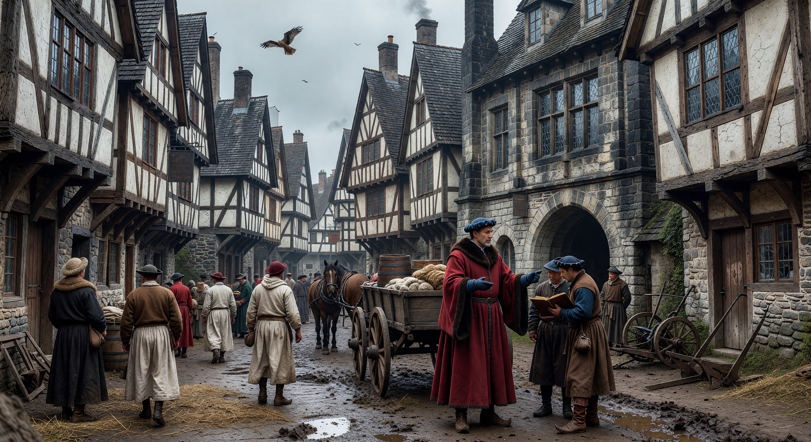Dans cette ruelle animée d'une ville d'Europe du Nord au XVe siècle, de hautes maisons à colombages et à encorbellement surplombent un passage boueux où s'activent marchands et citadins. Ce décor illustre l'essor d'une classe bourgeoise prospère, ici représentée par un riche négociant en houppelande rouge négociant près d'une imposante halle aux fenêtres de verre plombé. Entre les façades de torchis blanchies et le ciel lourd du Petit Âge Glaciaire, chaque détail architectural et vestimentaire témoigne des mutations sociales et économiques profondes de la fin du Moyen Âge.
