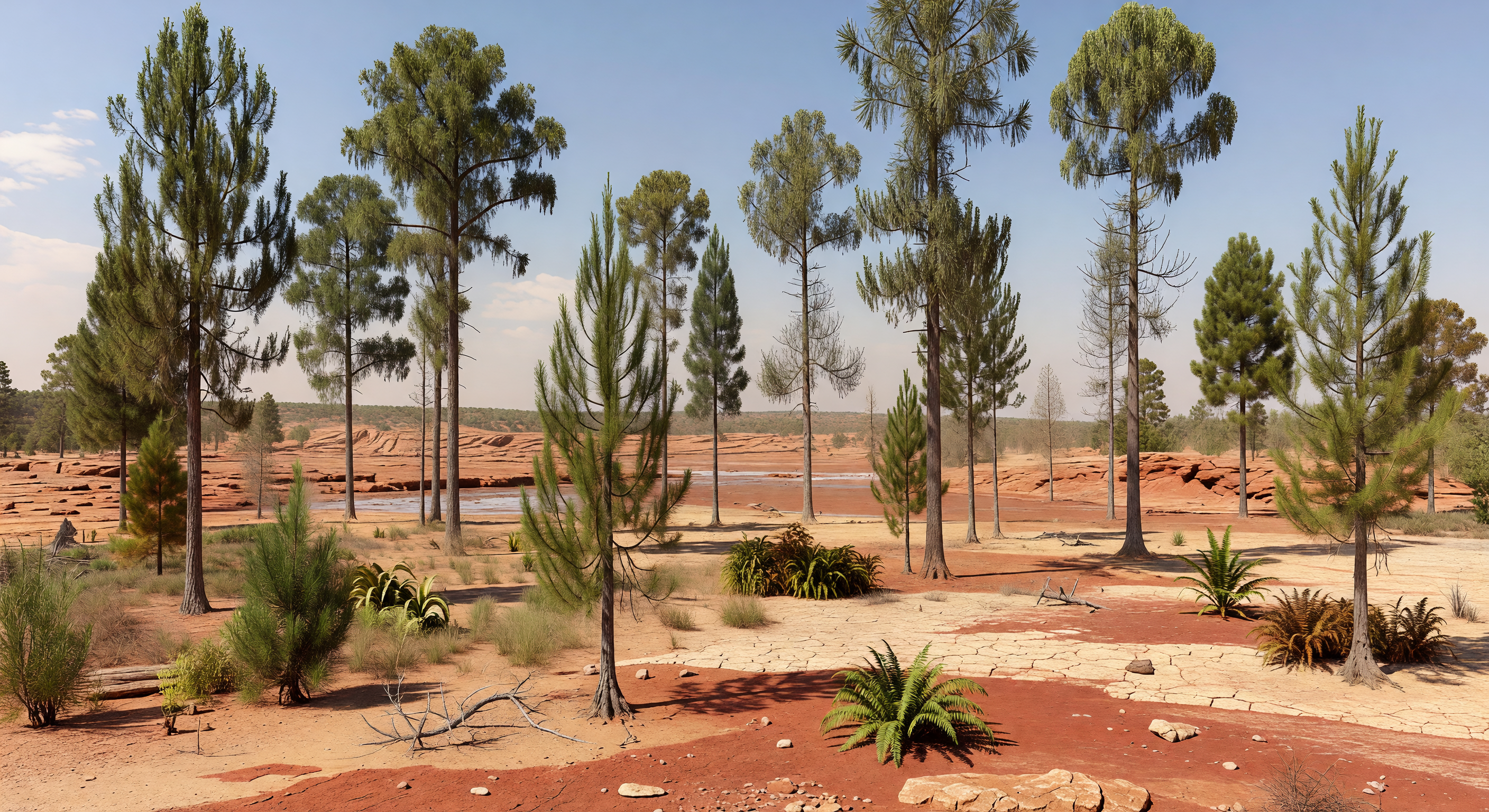 L’image représente un paysage semi-aride avec des sols sableux rouge rouille, des surfaces pâles fissurées évoquant des calcrètes, des affleurements lointains de grès rouge stratifié et des formes rappelant des chenaux éphémères, éléments géologiquement plausibles pour les marges de bassins intra-pangéens du Carbonifère supérieur tardif dans un climat saisonnièrement sec. Cependant, la flore est fondamentalement anachronique et visuellement incohérente avec cette période. Les grands arbres dominants sont figurés comme des espèces modernes de Pinus, avec des faisceaux d’aiguilles, une ramification symétrique et une écorce de type pin, ce qui ne ressemble en rien aux Cordaites, caractérisés par de hauts troncs à branches clairsemées et dressées portant de longues feuilles rubanées (jusqu’à 1 m) regroupées en touffes terminales, leur conférant une apparence plus étrange, rappelant un palmier ou une couronne clairsemée. Les conifères plus petits disséminés ressemblent à des pins ou genévriers modernes plutôt qu’au port arbustif dense, verticillé et à feuilles écailleuses de Walchia. Les éléments du sous-bois comprennent des touffes herbacées de type graminée (les graminées ont évolué vers ~140 Ma au Crétacé), des fougères en épée génériques (ne correspondant pas aux immenses frondes bipennées de Medullosa avec organes semenciers), et surtout des rosettes succulentes fortement anachroniques évoquant Agave ou Aloe (monocotylédones angiospermes, postérieures au Jurassique). Aucune faune ni autre détail propre à la période n’est visible, mais les discordances botaniques dominent, donnant à la scène l’aspect d’une savane moderne de pins australiens. Ces inexactitudes fondamentales exigent une régénération complète avec des reconstitutions authentiques de plantes paléozoïques.