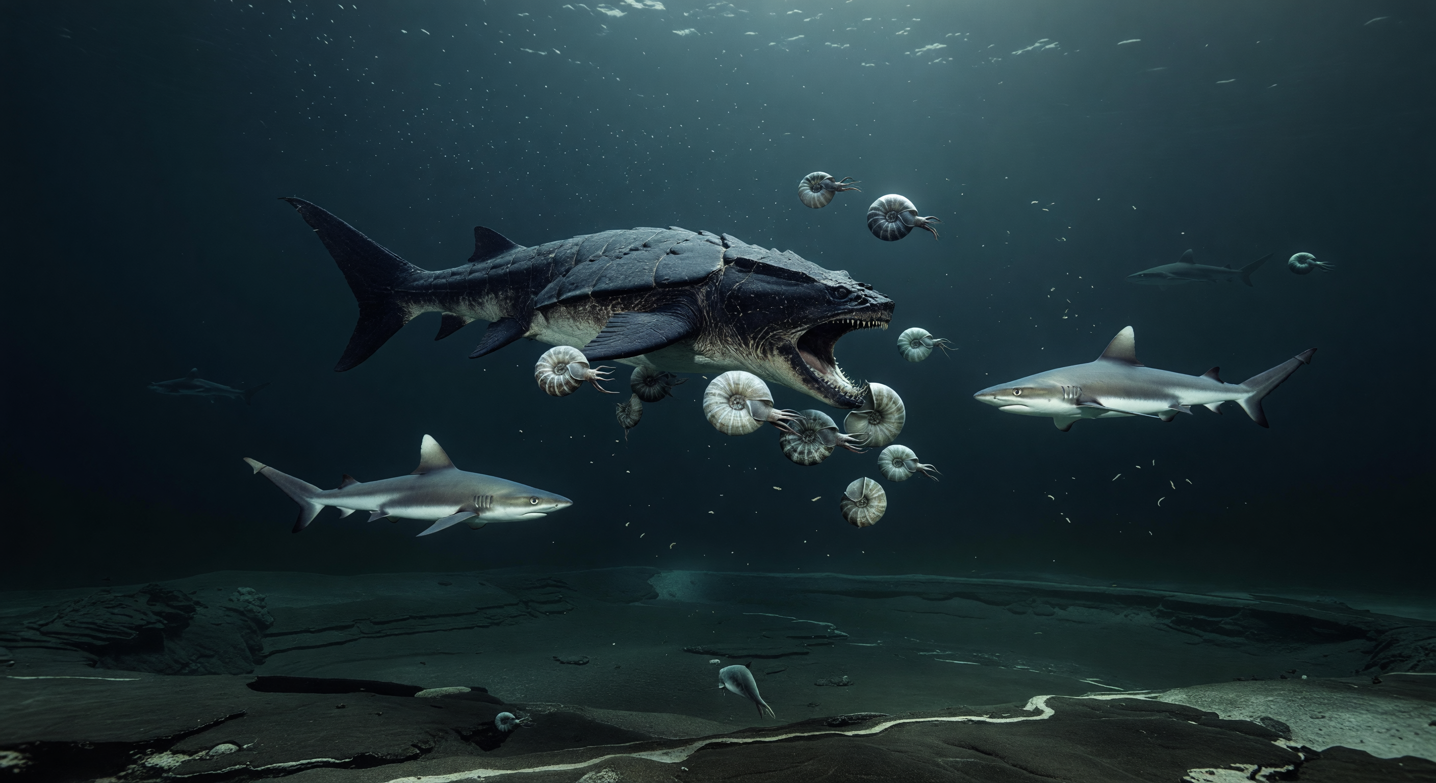 Dans les eaux bleu-vert assombries du Dévonien supérieur, il y a environ 380 à 360 millions d’années, un immense Dunkleosteus terrelli — un placoderme cuirassé de 5 à 6 mètres — fond sur un petit banc de Manticoceras, tandis que deux requins primitifs Cladoselache tournent autour de la scène, leurs ventres pâles brillant dans la pénombre. Sous eux s’ouvre un bassin profond de la Laurussia, dont le fond vaseux et noir, riche en schistes laminés, évoque des eaux souvent pauvres en oxygène où tombait sans cesse une « neige marine » de particules organiques. Cette reconstitution montre un monde pélagique bien antérieur aux reptiles marins et aux poissons modernes, dominé par de redoutables chasseurs cuirassés, des ammonoïdes à coquille enroulée et les premiers requins de pleine mer.
