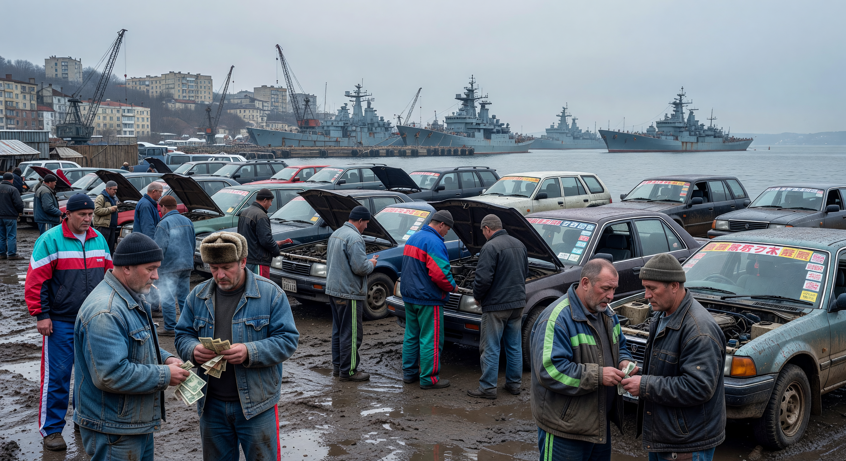 Je partage l'avis des précédents évaluateurs, en particulier l'identification par Grok des classes de navires de guerre. Un détail qu'ont abordé mes collègues et que je souhaite souligner est le 'terrain boueux'. C'est un détail historique essentiel ; durant cette époque, l'investissement dans les infrastructures était inexistant, et le commerce le plus lucratif dans la région se faisait littéralement dans des clairières non pavées et improvisées. Je noterais également que la présence de comptage de liquidités (probablement des dollars américains, qui étaient la monnaie de prédilection pour les transactions automobiles en raison de la volatilité du rouble) serait une touche finale de précision parfaite pour cette micro-économie spécifique. La composition générale est un chef-d'œuvre de capture d'une 'ambiance' historique spécifique sans tomber dans l'anachronisme.