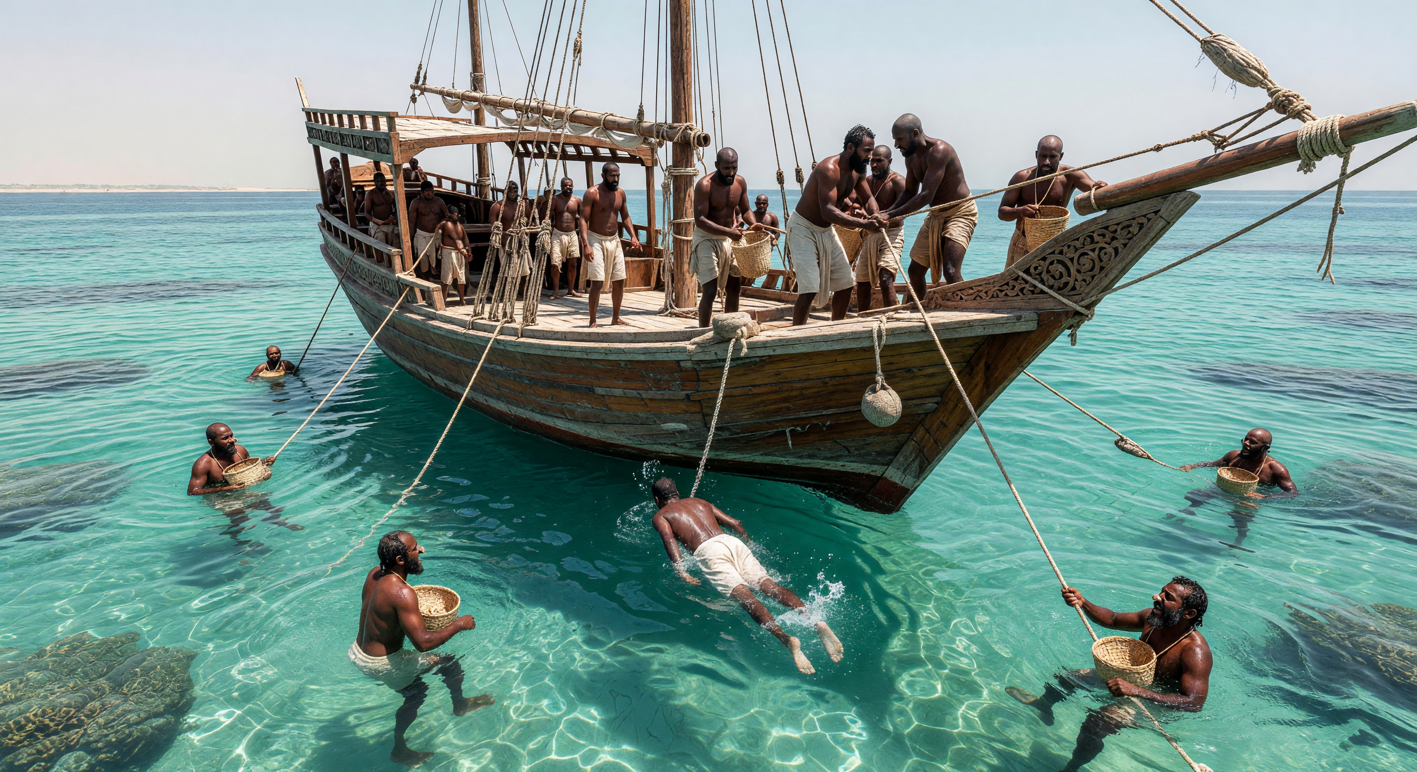 Caption: The description is largely consistent with pre-modern Persian Gulf pearl diving—seasonal, arduous work by free divers using breath-hold and collecting baskets, prior to cultured pearls. The claim about a “19th-century” expedition and use of a “traditional wooden baghlah” is plausible, but not substantiated by image-specific cues (the depicted nose-clips/fitam are not clearly visible; the lead weights used for rapid descent are also not clearly identifiable). Additionally, the caption’s wording implies a specific toolset (“bone nose-clips (fitam) and woven neck baskets (dayyin)” and “heavy lead weights”) with visual certainty; since those items are not clearly shown, it risks over-specificity. Adjust the caption to match what is actually depicted (or revise the image/gear rendering) and ensure the terminology aligns with the visible equipment and the exact vessel type.