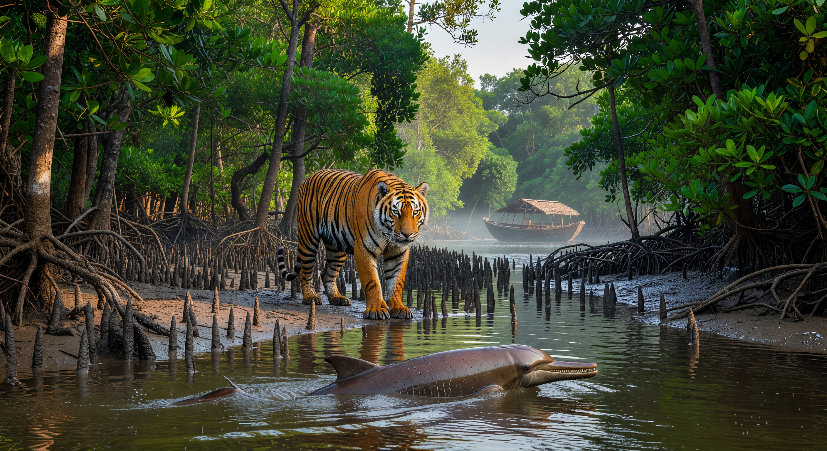 - 日本語: シュンドルボン湿地のマングローブに潜むベンガルトラ