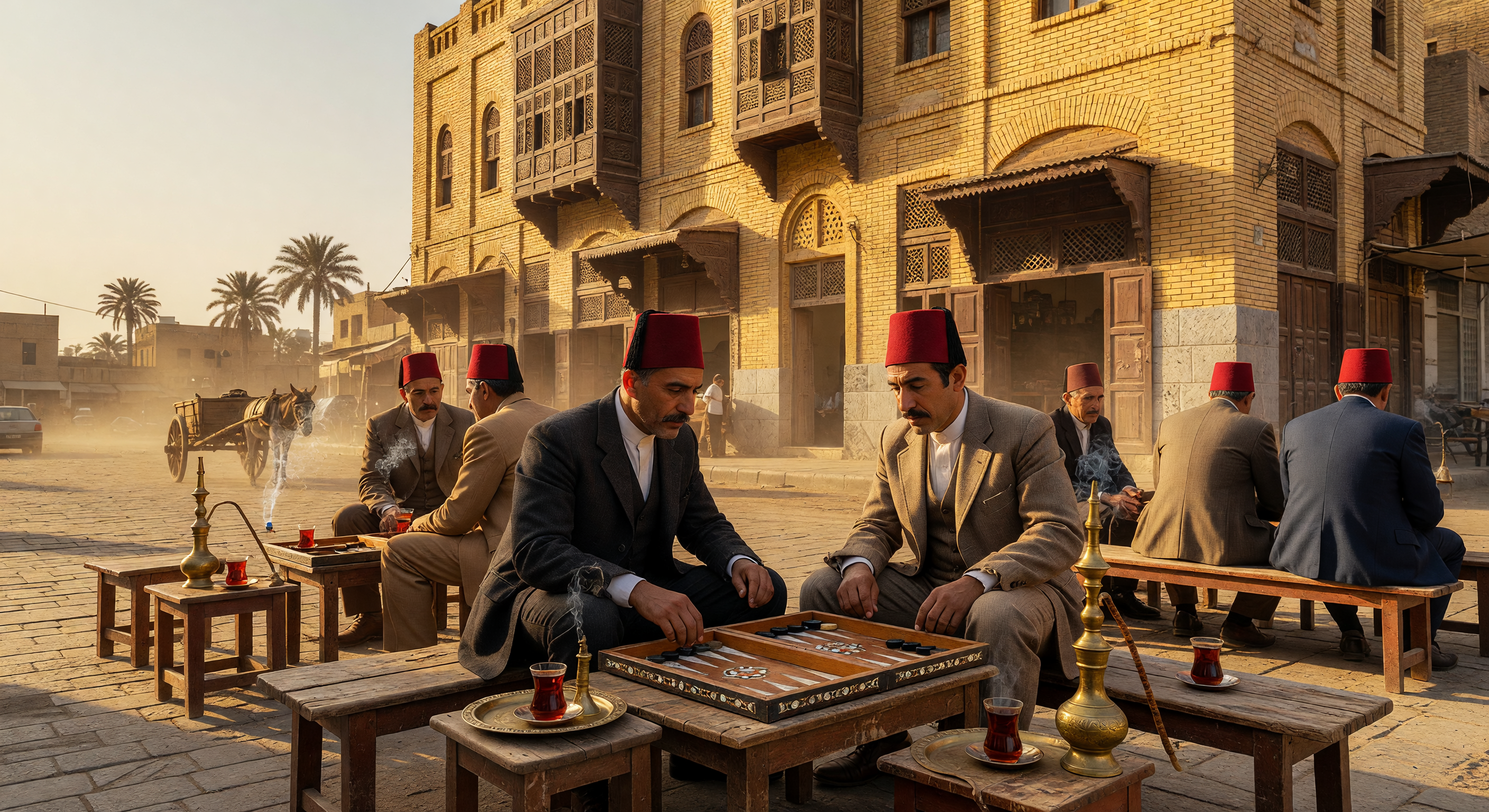 The image is highly accurate and plausible for 193s Baghdad. Men wear period-appropriate Western-style wool suits with vests paired with crimson tarbush (fez) hats, perfectly capturing the Effendiya look of urban, educated Iraqi middle-class men blending Ottoman and modern influences. The architecture features golden-yellow mud-brick buildings with intricate mashrabiya lattice screens on balconies, arched doorways, and wooden accents, matching historic Baghdadi Ottoman-era styles. Props like low wooden stools, brass trays with tulip-shaped istikan tea glasses, hookahs (nargile), a backgammon board (tavla), and a horse-drawn cart in the dusty street enhance authenticity. Date palms, hazy Mesopotamian atmosphere, and warm lighting add regional coherence without anachronisms—no modern cars, vehicles, or tech visible; the background elements are purely era-appropriate. Cultural details like outdoor qahwa seating and communal gaming are spot-on, with strong visual coherence and no scientific inaccuracies in geology or biology.