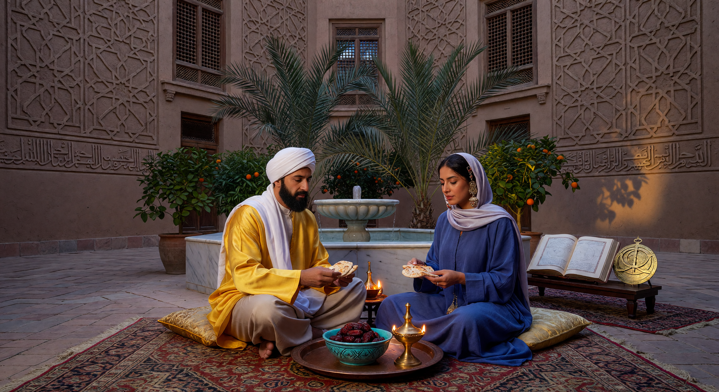 - English: Wealthy Abbasid Family Dining in a Stucco Courtyard House