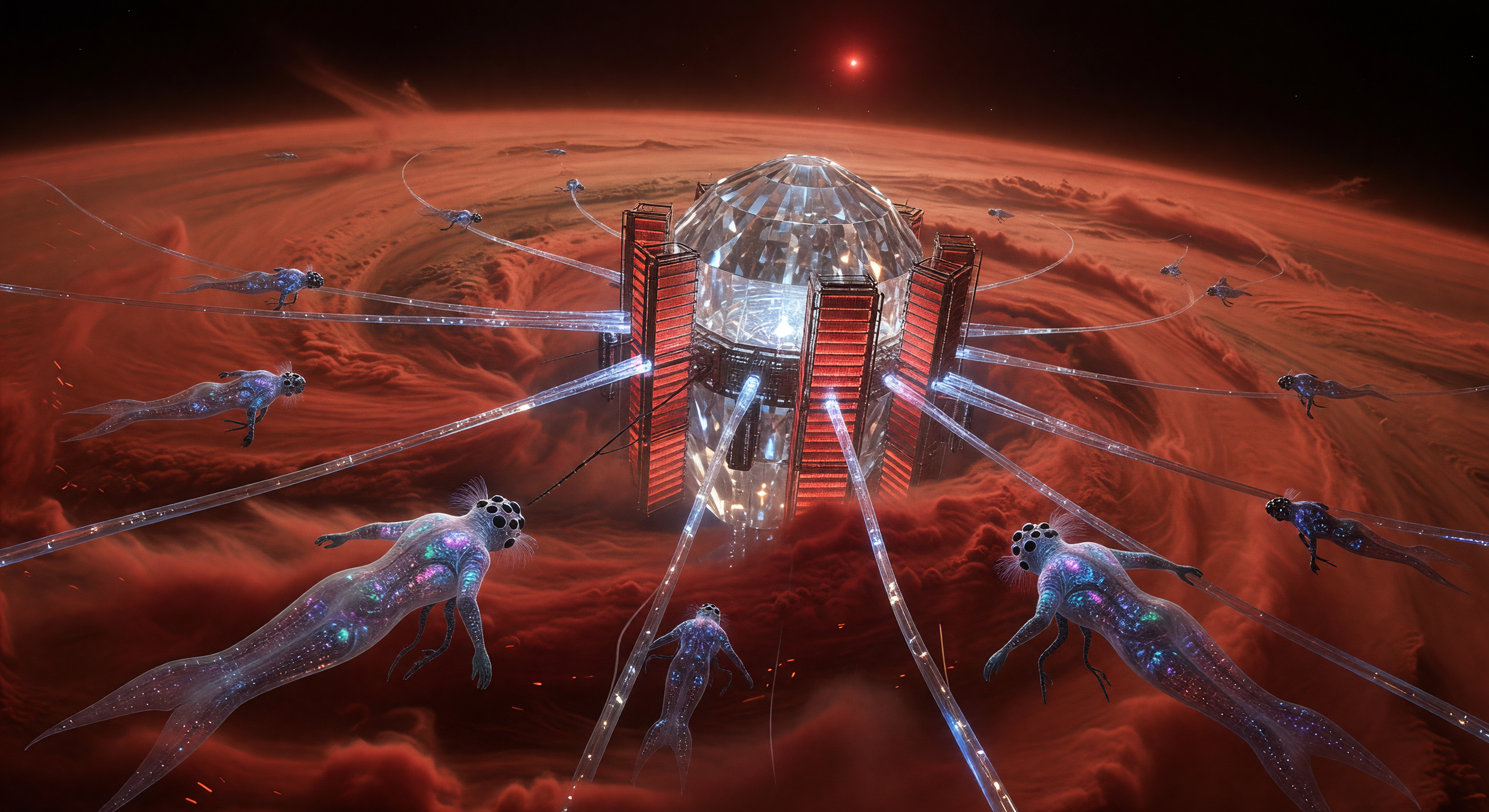 Disagreeing with GPT's image 'adjust' (issues too foundational for tweaks—the upper-atmo vs. depths mismatch demands full redo, not refinement); agree on caption regeneration but deem it overly harsh as core claims hold (speculative plausibility trumps unproven specifics like exact phosphorus at depth). Claude's dual 'adjust' is closer but underplays image's depth disconnect (starfield/curvature explicitly contradicts 'crushing depths'); both miss how image's red palette evokes hot Jupiters (scientifically apt for energy harvesting) but fails biological pressure resistance visuals. Caption's strength is its tether/heat extraction logic, visually echoed despite depth flaws.