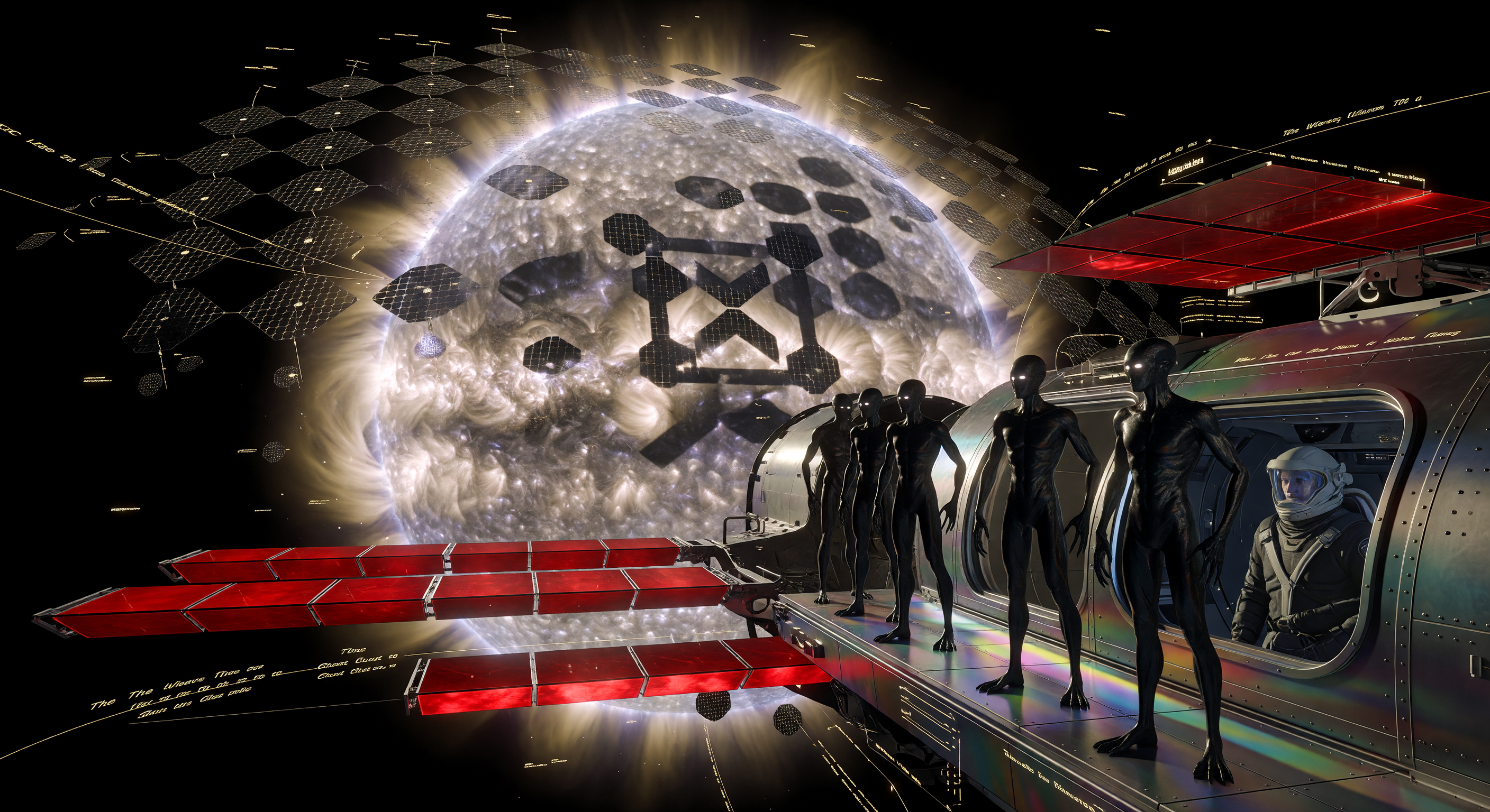 - English: Statite arrays forming geometric sigils against the solar corona