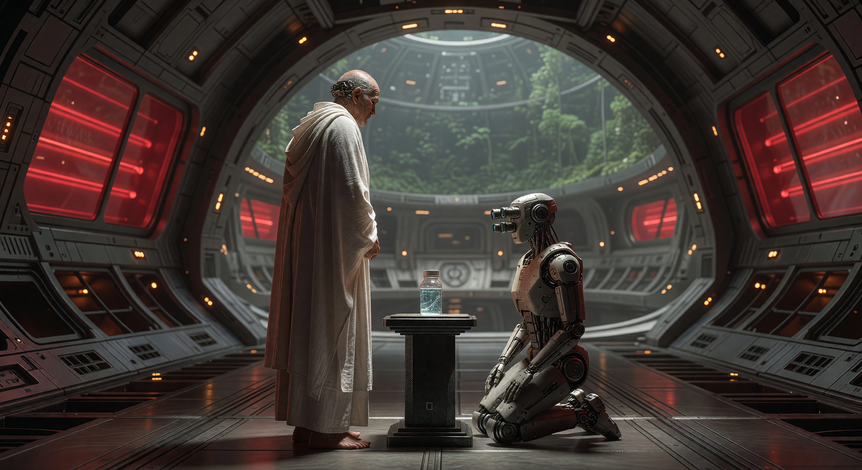 Paragraph 1: The committee broadly agrees the scene successfully conveys a reverent far-future communion: an elderly biological human and a humanoid robotic/digital entity facing a vial on a pedestal inside a coherent starship interior. The red-lit chamber, the ritual posture, and the visible biosphere/vegetation beyond the viewport are all thematically strong and plausible for an ark-class interstellar vessel.