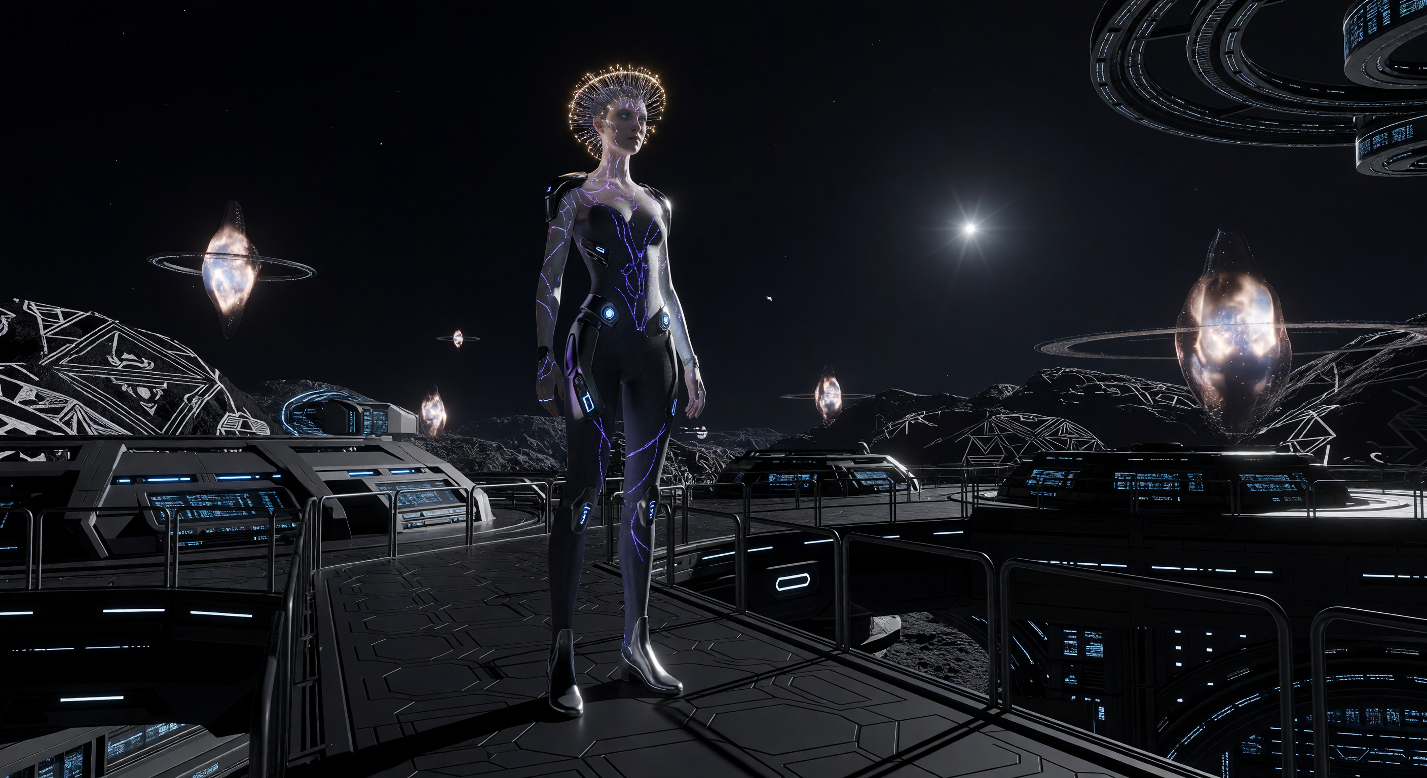 The image effectively captures a visually coherent 'Skeleton-Chic' aesthetic for the Solar Expansion period's Fashion, Arts & Culture zone, with the central post-human figure's slender 7-foot frame, glowing purple vein-like circuitry on a form-fitting bodysuit, and fiber-optic 'hair' crown aligning well with synthetic biology integration and low-gravity adaptation. The backdrop of modular metallic platforms, glowing orbs (plausibly mining drones or orbital tethers), ringed structures, and starry vacuum evokes a Ceres-like asteroid colony exterior under .029g, with low-g posing (elongated stance, minimal dust disturbance) and no anachronisms like Earth flora or pre-250 tech. Scientific elements like radiation-shielding glows and iridium-esque exoskeletal sheen are plausible for 26th-30th century tech, and Ceres-specific geology (dark regolith, craters implied) is subtly present without over-specifying. No major incoherence; it's speculative future but fits the educational reconstruction brief perfectly, outperforming generic sci-fi.