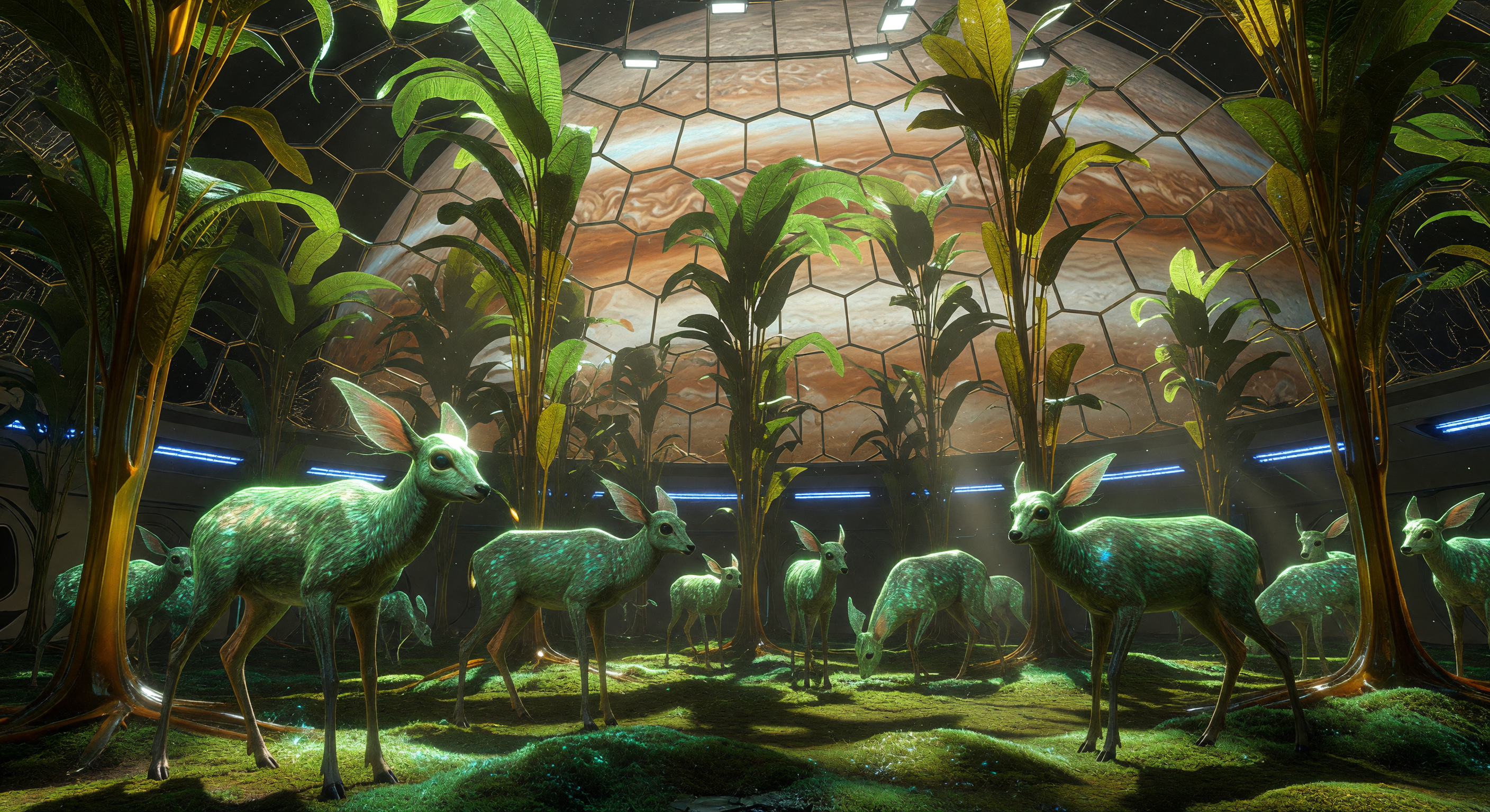 Sous l'imposante silhouette ocre de Jupiter, une harde de cervidés hybrides jovien-terriens évolue dans une forêt d'arbres-varechs géants culminant à cent mètres, au cœur d'un dôme pressurisé sur Ganymède. Durant l'ère de l'Expansion Solaire (2500-3000), ces formes de vie furent génétiquement optimisées pour la faible gravité de 0,146g, dotant les animaux d'une fourrure bio-réflectrice émeraude et de structures osseuses renforcées par des nanotubes de carbone. Ce biome synthétique témoigne d'une époque charnière où l'ingénierie biologique a permis de coloniser les lunes galiléennes, utilisant des réseaux de fusion pour simuler le spectre solaire nécessaire à la photosynthèse de ces organismes silicifiés.