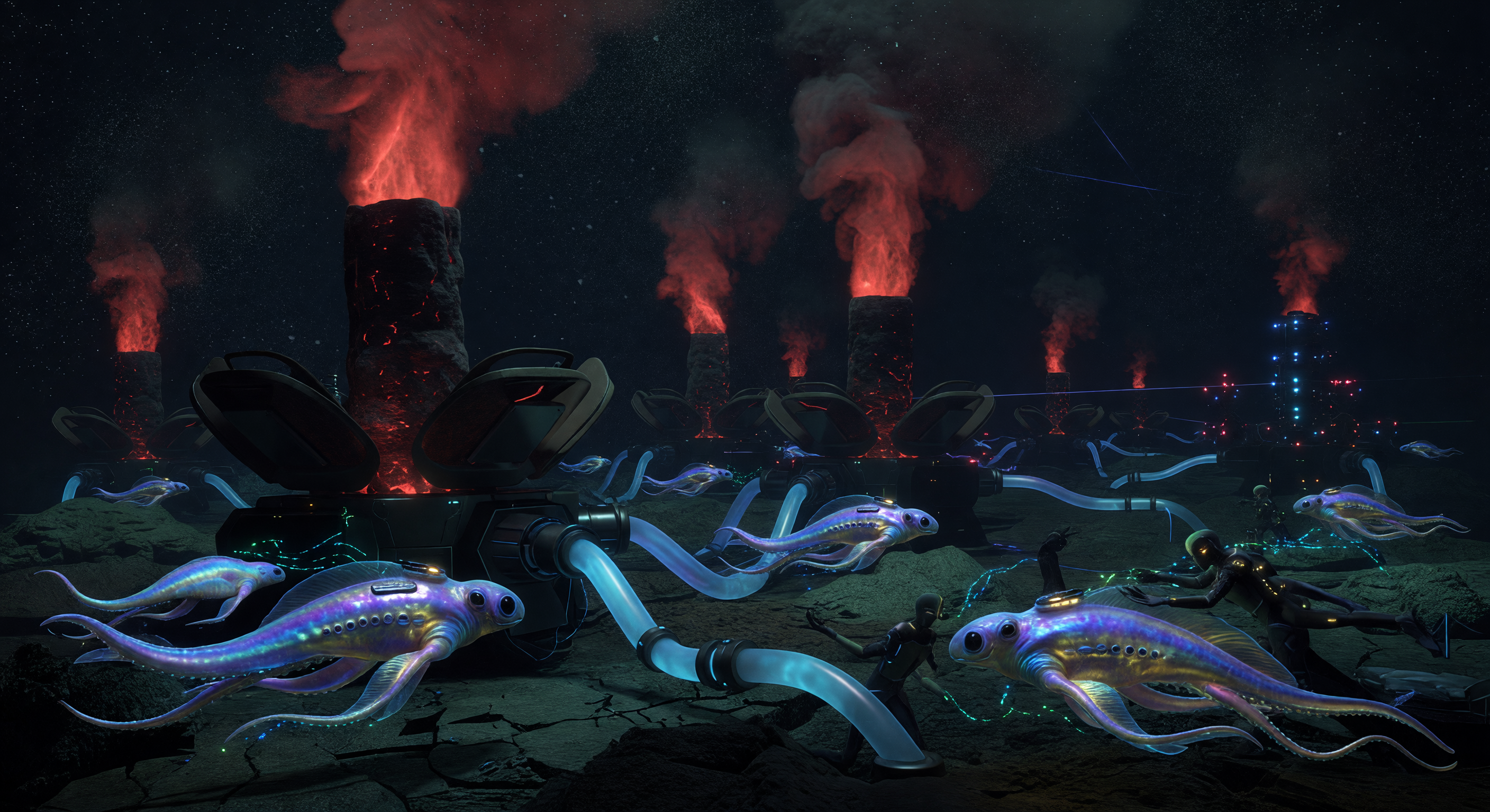 The image succeeds in conveying a visually compelling deep-ocean industrial environment with bioluminescent cephalopod-like beings, humanoid figures in dark suits, and large thermal vent structures. The bioluminescent chromatophore-inspired coloration of the hybrid beings is well-realized and consistent with the caption's biological description. The industrial piping and harvesting machinery create a plausible sense of infrastructure. However, the most significant scientific inaccuracy in the image is the depiction of open flames and smoke rising from the hydrothermal vents. This is physically impossible in a subsurface ocean environment — combustion cannot occur underwater, and hydrothermal vents emit superheated mineral-rich fluid, not fire and smoke in an open-air sense. This misrepresentation is a meaningful scientific error that should be corrected in a revised render, replacing flames with billowing superheated mineral-rich plumes, particulate clouds, and heat shimmer effects appropriate to underwater conditions. The presence of a visible starfield in the background is also contradictory to the stated 20km subsurface ocean setting.